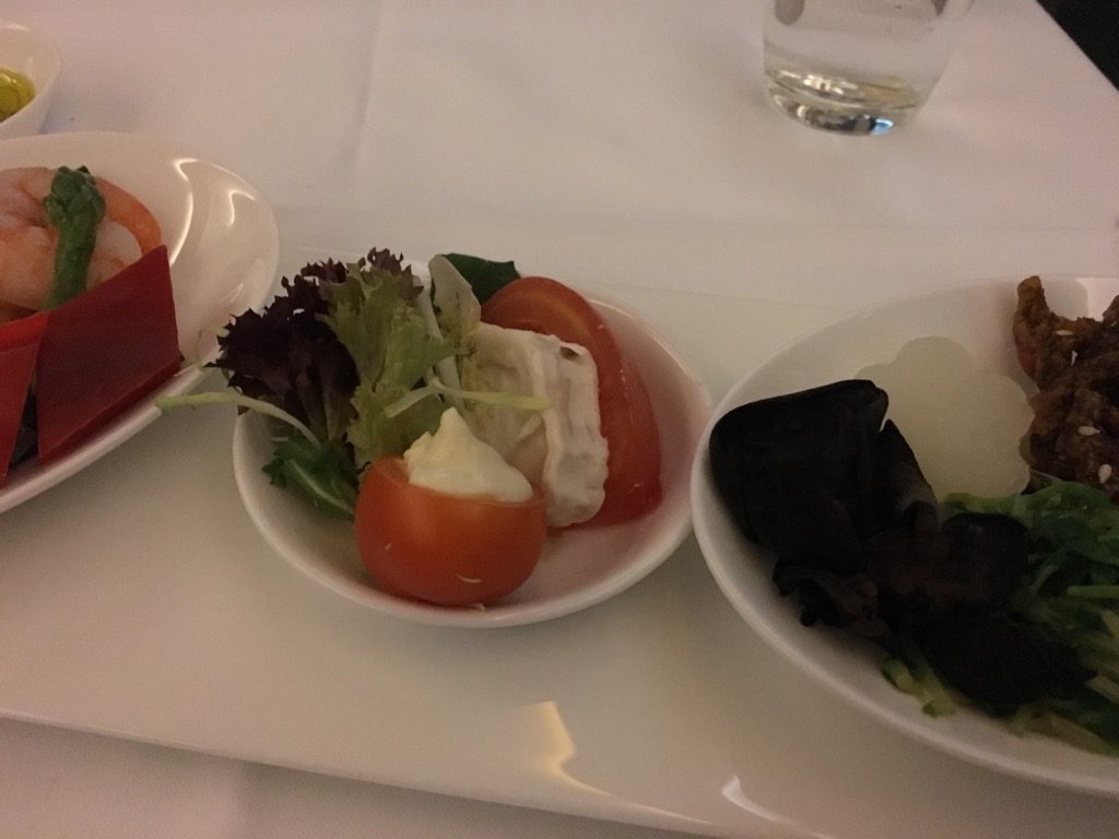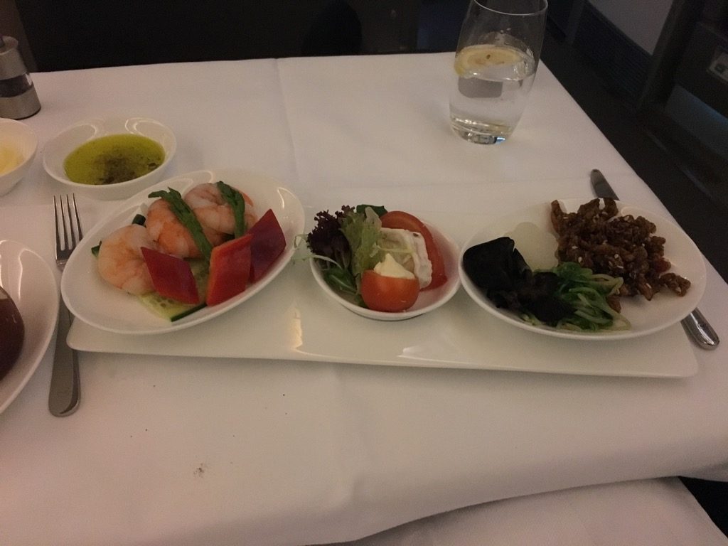 Bei den Vorspeisen nach dem Kaviar konnte ich mich einmal wieder nicht entscheiden und habe daher alle drei ausgewählt. Auch wenn alle Vorspeisen gut waren, fehlte mir hier auch ein wenige das „Besondere“, was man in einer First Class durchaus erwarten könnte. Auch werden in der Lufthansa First Class ab Hongkong exakt die selben Vorspeisen, wie in der Business Class serviert. Nur muss man in der Business Class eine Vorspeise wählen.