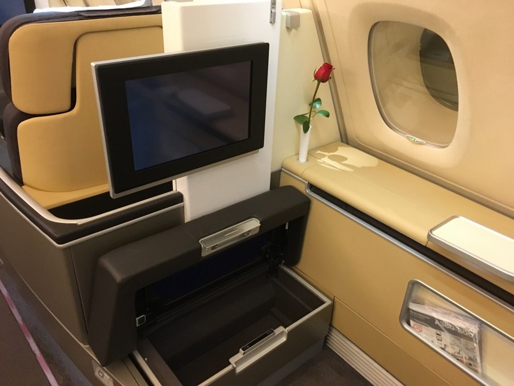Die Lufthansa First Class Kabine im Airbus A380 ist in meinen Augen eine der schönsten First Class Kabinen der Welt. Die Farbwelt und die verwendeten Werkstoffe lassen die Kabine schon beim Betreten extrem hochwertig wirken. Von der roten Rose an jedem Platz, über die mit Alkantara bespannten Wände, bis hin zu den vielen Designelementen, welche durch verschiedene Dekolichter in Szene gesetzt werden, wie der Schriftzug „Luftahnsa First Class“ an der Kabinenwand. Die Kabine ist einfach wunderschön!
