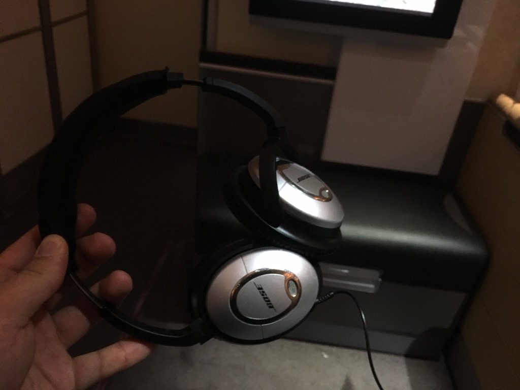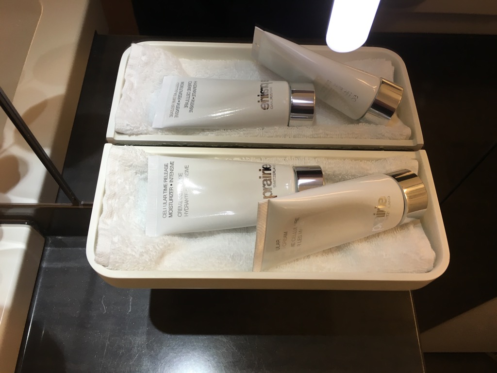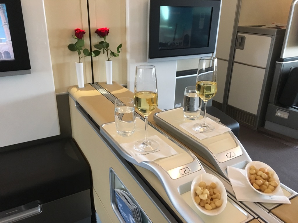 Nach einer kurzen Wartezeit im Finger konnten wir nach einer freundlichen Begrüßung seitens der Crew nach links in die First Class abbiegen. Hier wurden uns auch direkt unsere Plätze gezeigt und wir wurden mit je einem Pyjama und Amenity Kit versorgt. Unser Handgepäck wurde in Schränken verstaut und wir wurden gefragt was wir trinken möchten.