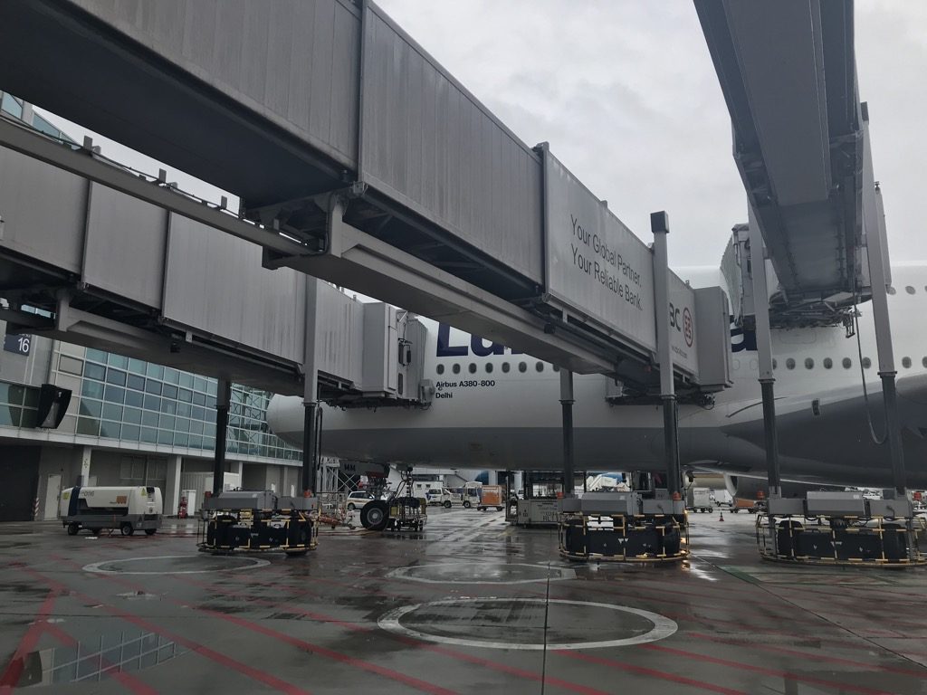Zu Beginn unserer Flitterwochen ging es mit Lufthansa First Class im Airbus A380 nach Delhi. Wie üblich haben wir unsere Reise im First Class Terminal in Frankfurt gestartet. Nachdem wir von der PA zum Boarding abgeholt wurden, wurden wir von einem sehr netten Fahrer zum Flugzeug an die C-Gates gefahren. Trotz leichtem Regen bot sich hier die Möglichkeit einige schnelle Fotos vom Flugzeug zu machen. Lustigerweise flogen wir mit der „Delhi“ nach Delhi. Bis zwei Tage vor dem Flug waren wir sogar komplett alleine in der First Class. Letztendlich waren wir dann zu fünft, aber das war alles andere als schlimm.