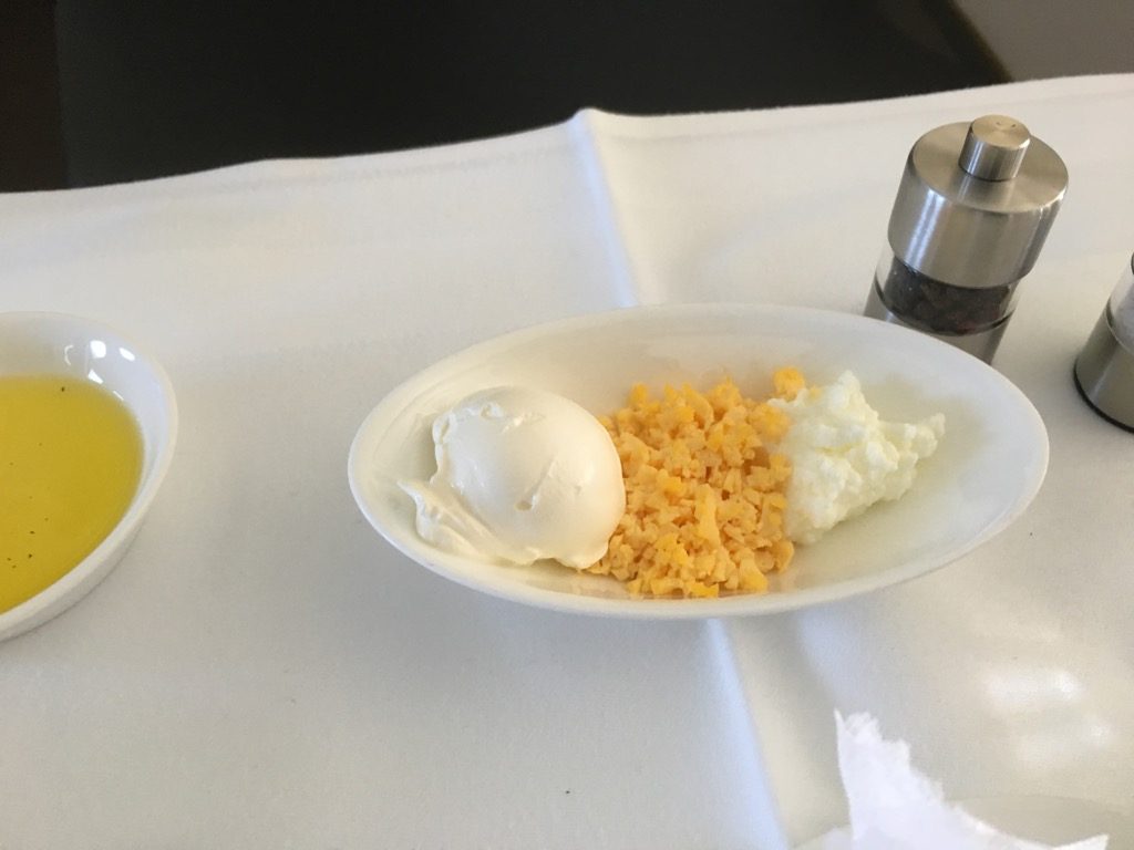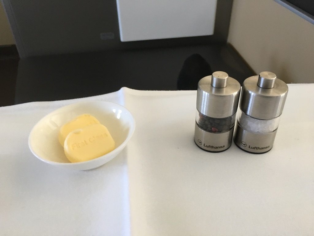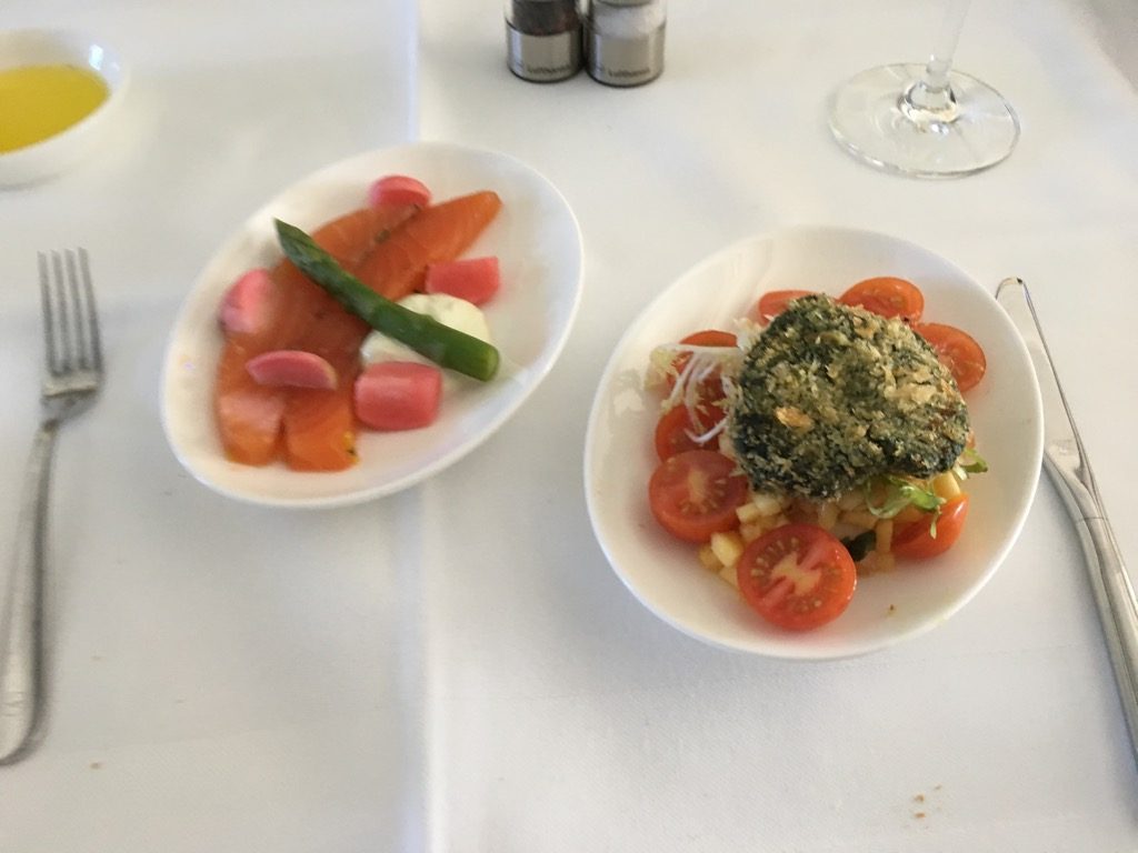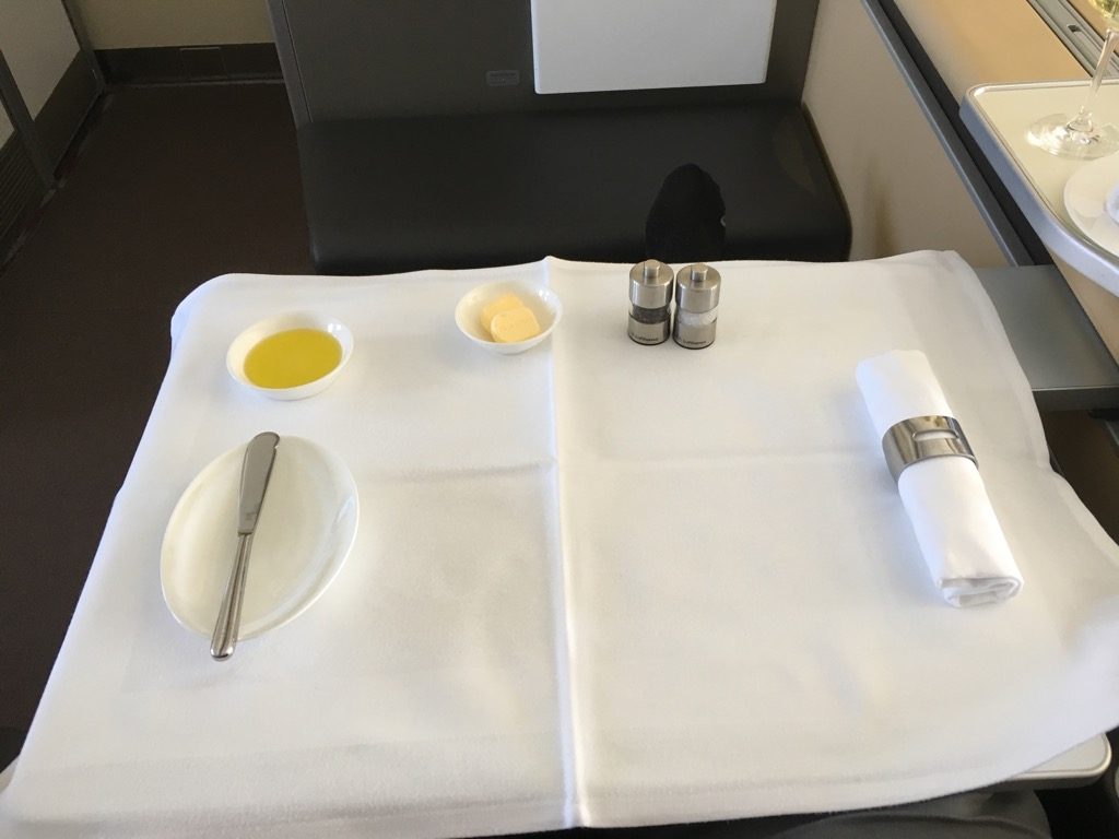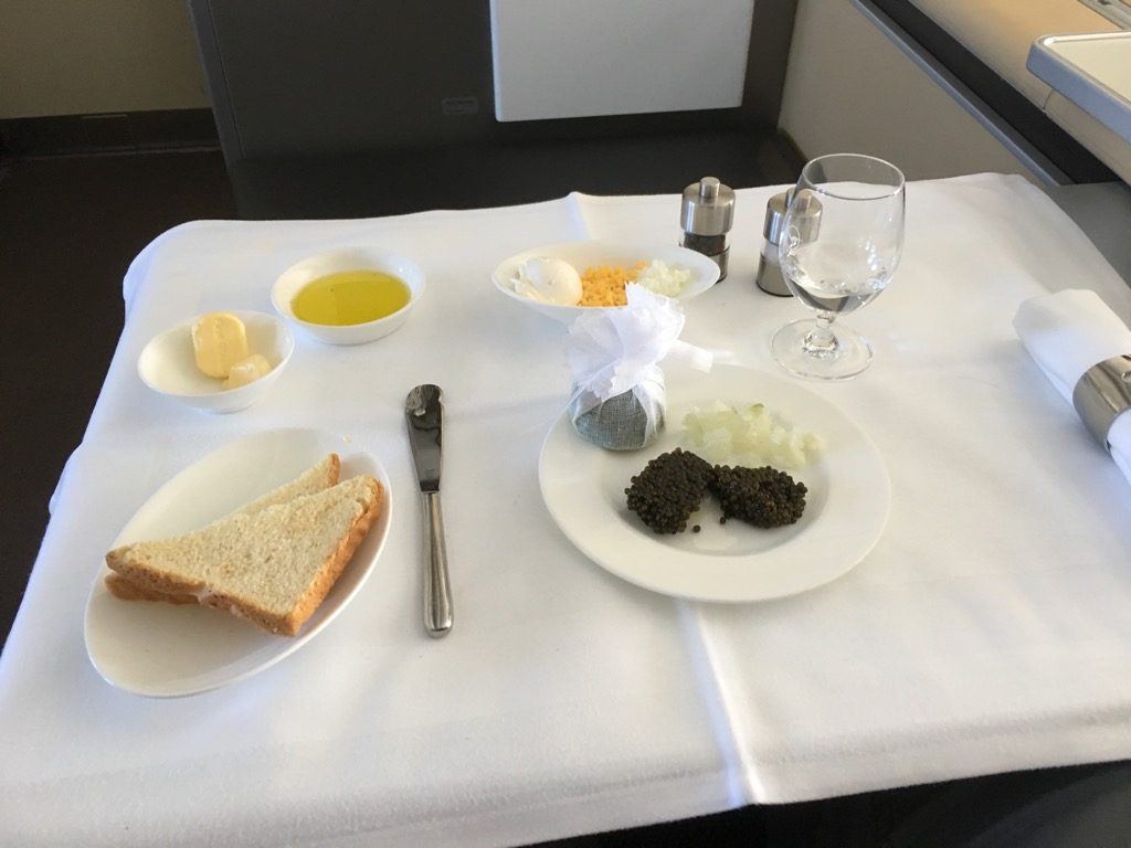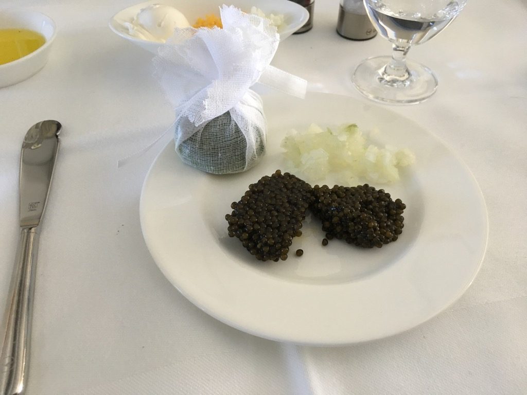 Direkt nach dem Start wurde mit dem ersten Service begonnen. Neben dem Abfragen unserer Getränkewünsche, wurde auch mit dem vorab ausgesuchten Menü begonnen. Zu Beginn wurde eine Auswahl an Backwaren gereicht, mit Butter, Olivenöl, Salz und Pfeffer. Danach ging es wie üblich mir einem Kaviargang weiter, der von einem Wagen aus durchgeführt wurde.