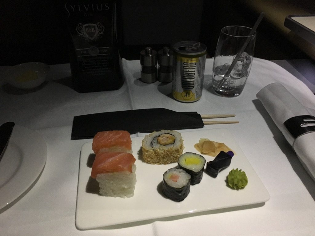 Etwa eineinhalb Stunden vor der Landung bekam ich Hunger und bestellte mir den Burger von der Snack Karte. Hier lässt sich ausnahmsweise mal wirklich der Begriff „Food-Porn“ verwenden. Der Burger hat unglaublich gut geschmeckt. Auch Christoph, der ihn probieren durfte, war so beeindruckt, dass er sich nach dem Sushi auch einen bestellte. Als Dessert gab es für mich dann noch Karamelleis und Beeren. Christoph bevorzugte einen „flüssigen Nachtisch“ in Form eines weiteren Gin & Tonic, immerhin war die „Spirituose des Monats“ auf diesem Flug ein Gin welchen er noch nicht kannte.