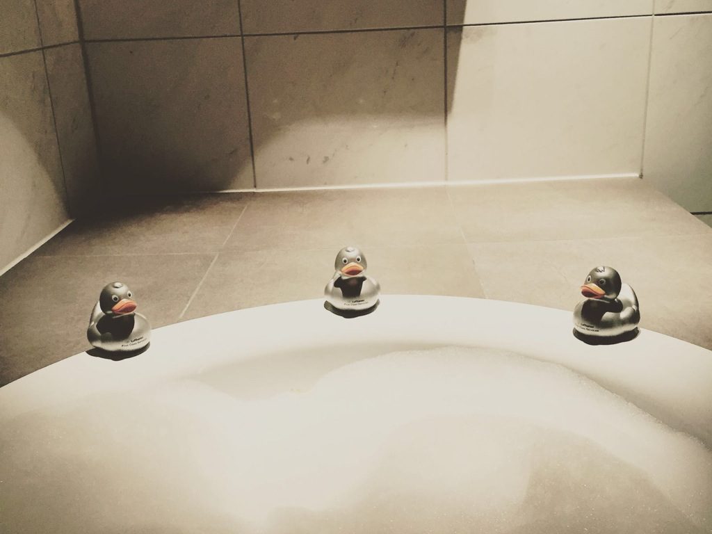 Nachdem man die Lounge betritt, werden die Bordkarten und gegebenenfalls HON Circle Karten von den Personal Assistent (PA) eingescannt. Sollt der Flug auf einer Vorfeldposition stehen, wird vom PA ein Limousinentransfer arrangiert. Mehr hierzu könnt Ihr weiter unten lesen. Direkt nach dem Empfang befinden sich auf der linken Seite die Toiletten, Duschen und Day Rooms. Zwei der vier Duschen sind neben Regenwald-Duschen auch mit einer Badewanne ausgestattet. Wenn Ihr duschen oder baden wollt, beziehungsweise euch in einem der Day Rooms ausruhen wollt, könnt Ihr Euch einfach an die Damen und Herren vom Housekeeping wenden. Übrigens erhaltet Ihr vom Housekeeping unter anderem auch Zahnbürsten, Rasiersets und die berühmten Lufthansa First Class Enten.