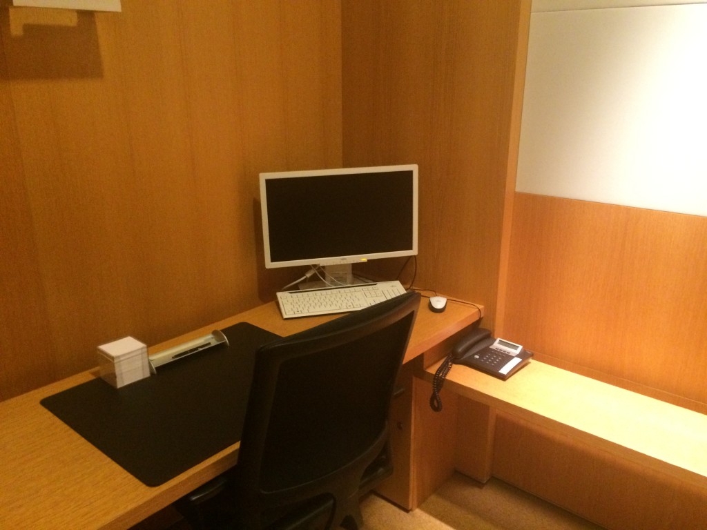 Auf der rechten Seite nach dem Eingang befinden sich die Workstations. Diese kleinen Räume sind absolut funktional eingerichtet. Neben einem Schreibtisch inklusive Schreibmaterial und Telefon, stehen in zwei der vier Workstations auch Computer zur Verfügung. Natürlich findet Ihr hier auch einige Steckdosen. WLAN ist in der gesamten Lounge vorhanden.