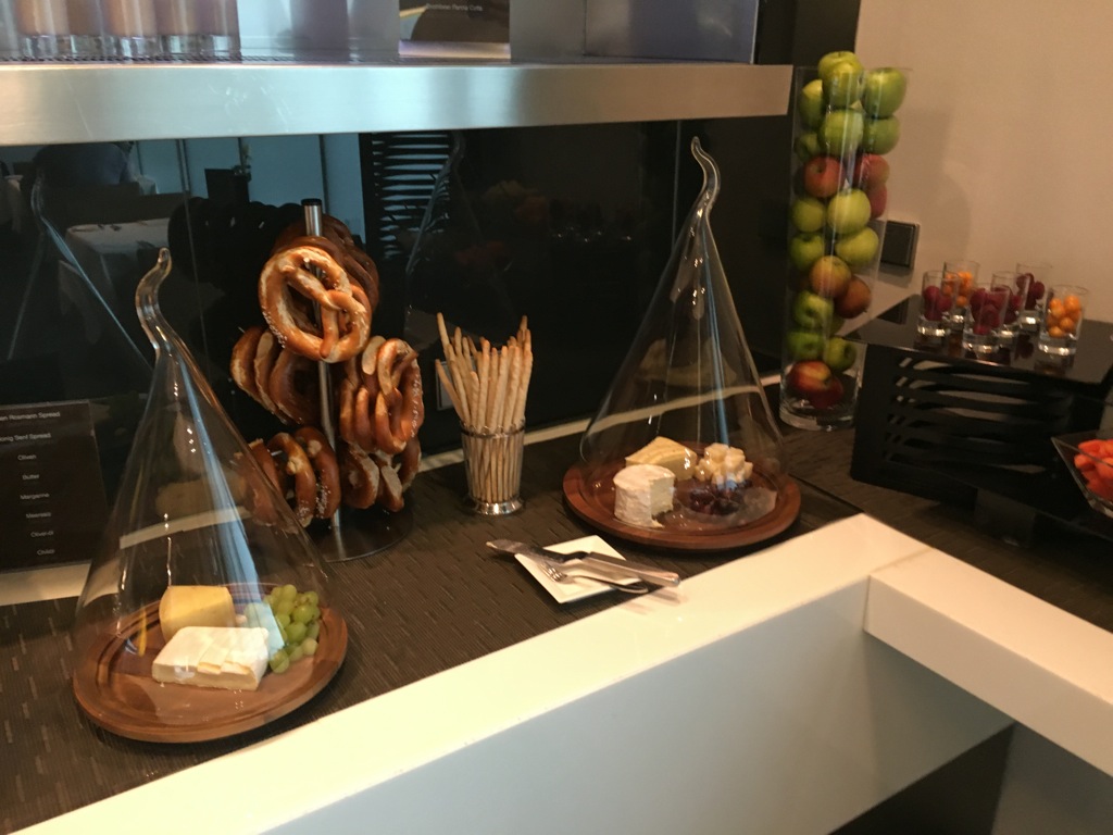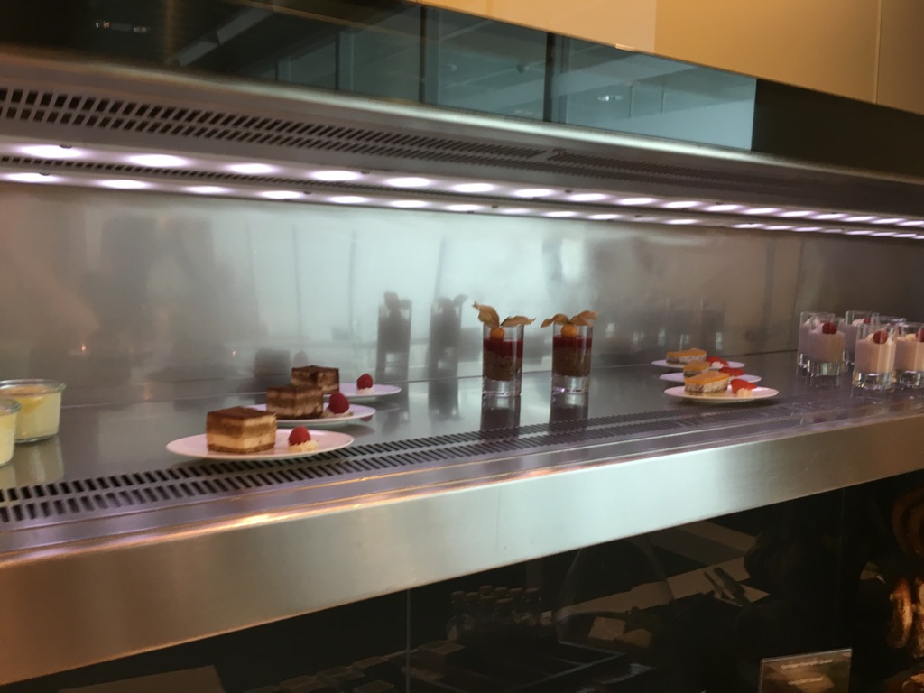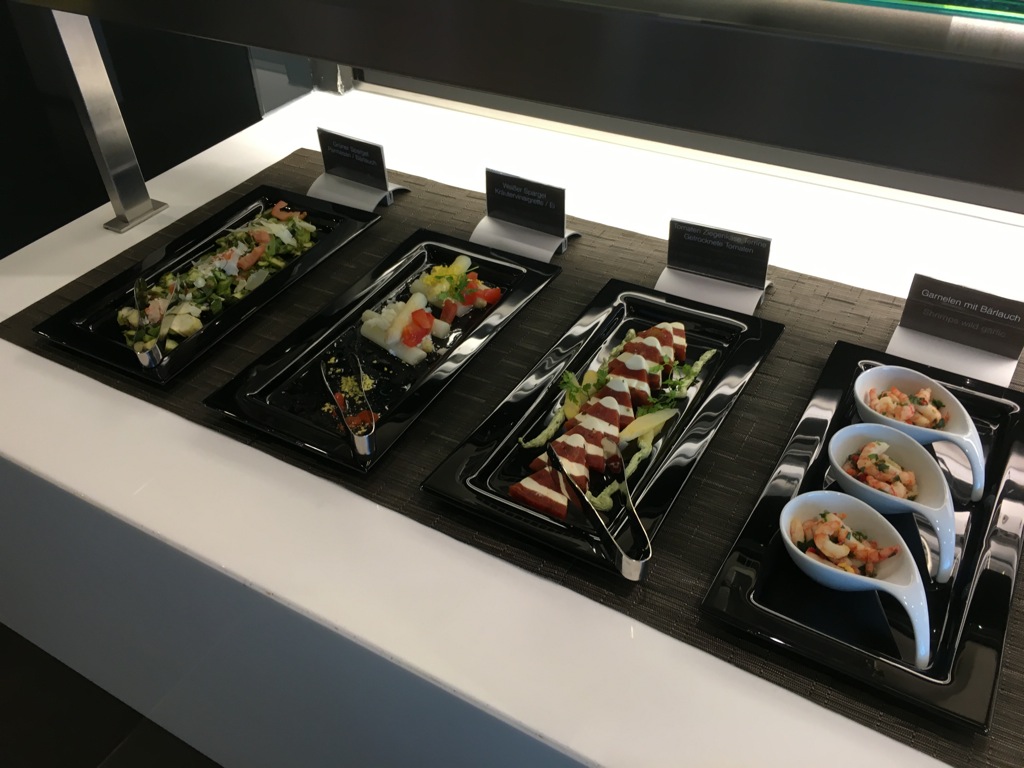 Für Vorspeisen, sowie besonders eilige Gäste gibt es ein kleines Buffet. Hier wird eine Außwahl an Vorspeisen oder Snacks, sowie Desserts angeboten. Auch ein wechselndes warmes Gericht gibt es immer auf dem Buffet. Dies ist insbesondere praktisch, wenn man nur wenige Minuten in der Lounge zum Essen hat. Allerdings kann die Küche auch einige Gerichte sehr schnell <10Minuten zubereiten. Wenn Ihr den Kellnern mitteilt wie viel Zeit Ihr habt, wird man Euch noch fast immer etwas frisch gekochtes servieren können.