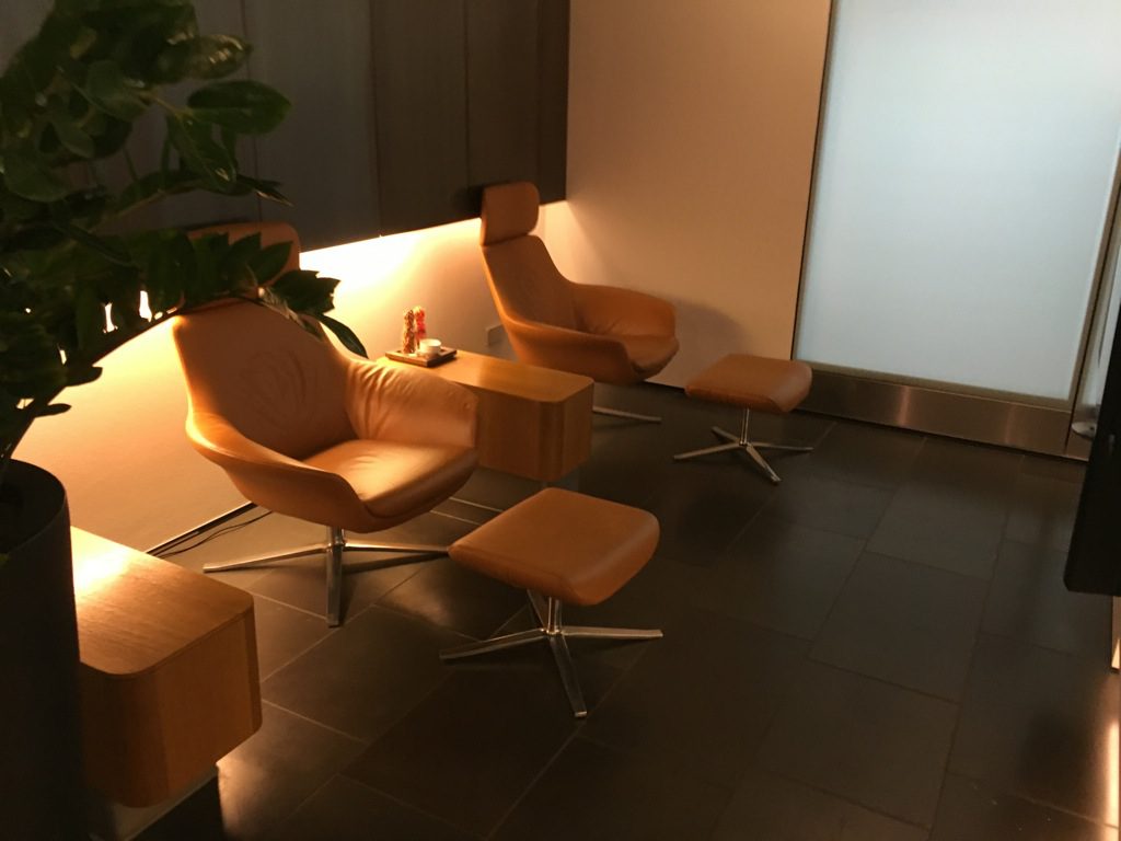 Die bekannten Sessel mit Ottomanen aus dem anderen Lufthansa First Class Lounges findet man natürlich auch in der Lufthansa First Class Lounge München. Diese befinden sich allerdings hier vor einem Fernseher. Die übliche Ausrichtung hin zum Fenster ist in dieser Lounge in München leider nicht möglich, da die Lufthansa First Class Lounge München über keine Tageslichtfenster verfügt, was ich auch als das größte Manko der Lounge ansehe.
