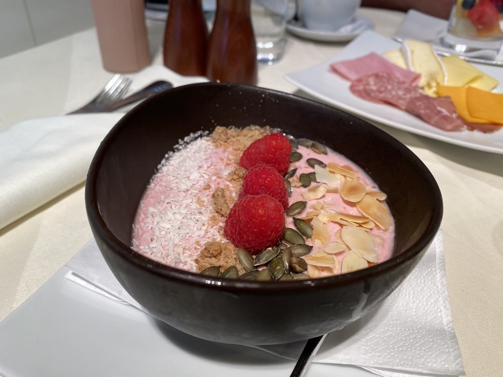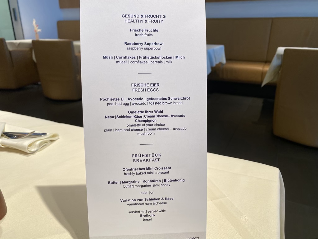 Das Buffet war komplett geschlossen. Aus einer kleinen, aber für uns ausreichenden Karte konnten wir uns Speisen und Getränke bestellen. Es gibt sowohl Auswahlmöglichkeiten für das Frühstück, als auch für Mittag- und Abendessen. Ebenfalls ist uns aufgefallen, dass die Tische nicht wie üblich bereits eingedeckt waren – dies erledigte aber das Personal direkt, nachdem wir uns gesetzt hatten.