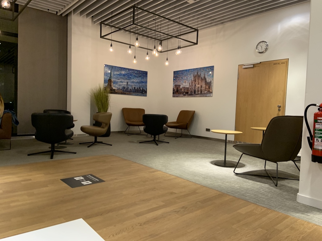 Die Lounge liegt eine Etage über der Ebene der Gates und kann entweder über eine Treppe oder einen Lift erreicht werden. Am Empfang wurde die Bordkarte kontrolliert, ebenfalls wurde nach einem Impfzertifikat oder einem negativen COVID-Test gefragt. Nach dem einchecken über die LUCA-App konnte ich die Lounge betreten.