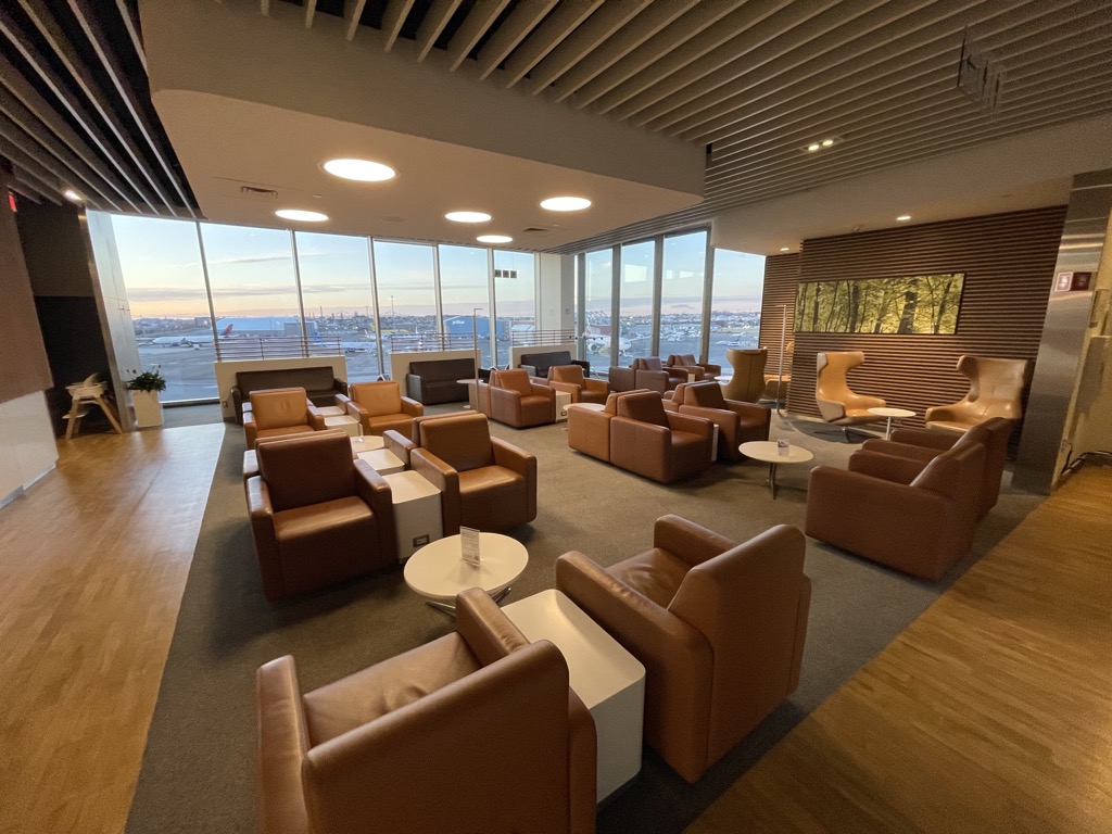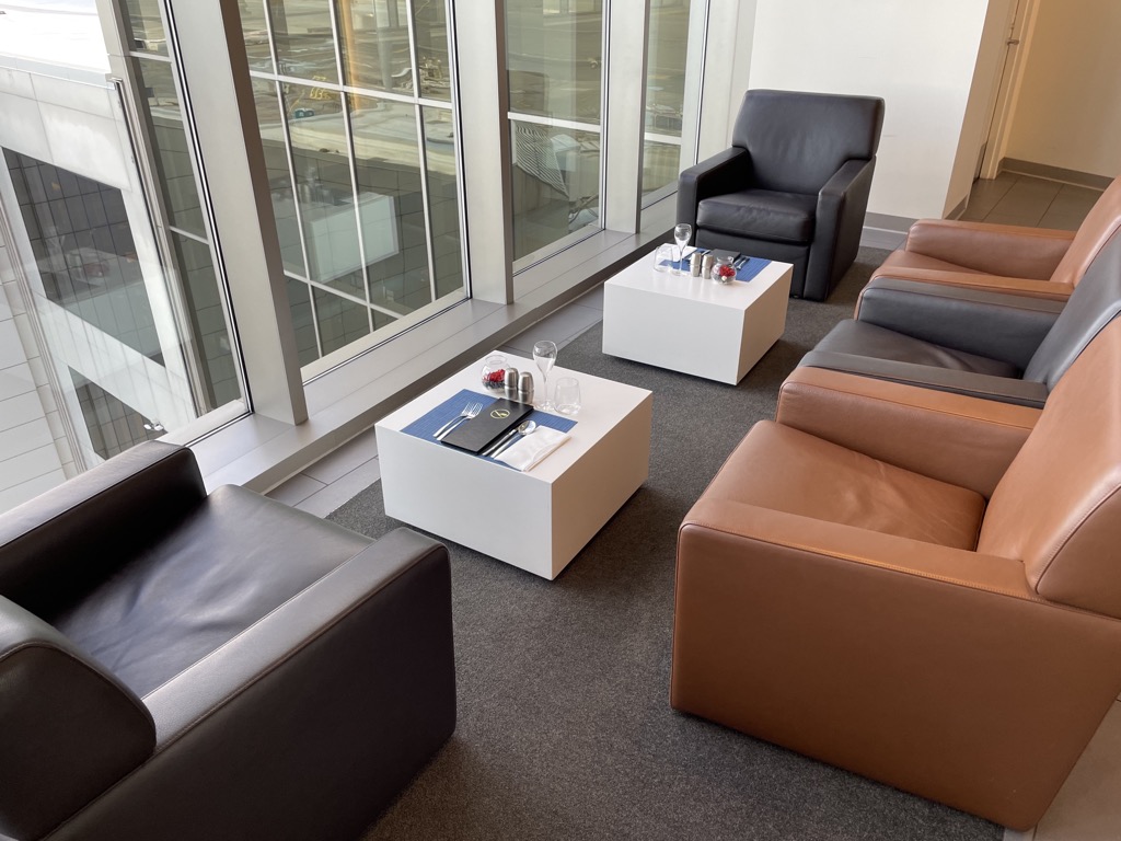 Der First Class Bereich in der Lufthansa Lounge in Boston besteht im Wesentlichen aus zwei Sitzgruppen, Ruhesesseln und Esstischen entlang einer großen Fensterfront.