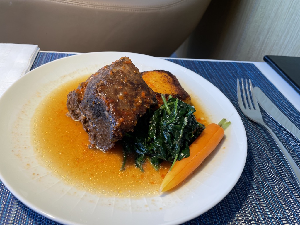 Mein Salat und die geschmorte Rinder Rippe waren sehr gut und schmeckten besser, als es die Bilder vermuten lassen. Für mich hatte dies den Vorteil, dass ich im Flugzeug auf das Essen verzichten und die weniger als 6 Stunden Flug nach Europa komplett zum Schlafen nutzen konnte.