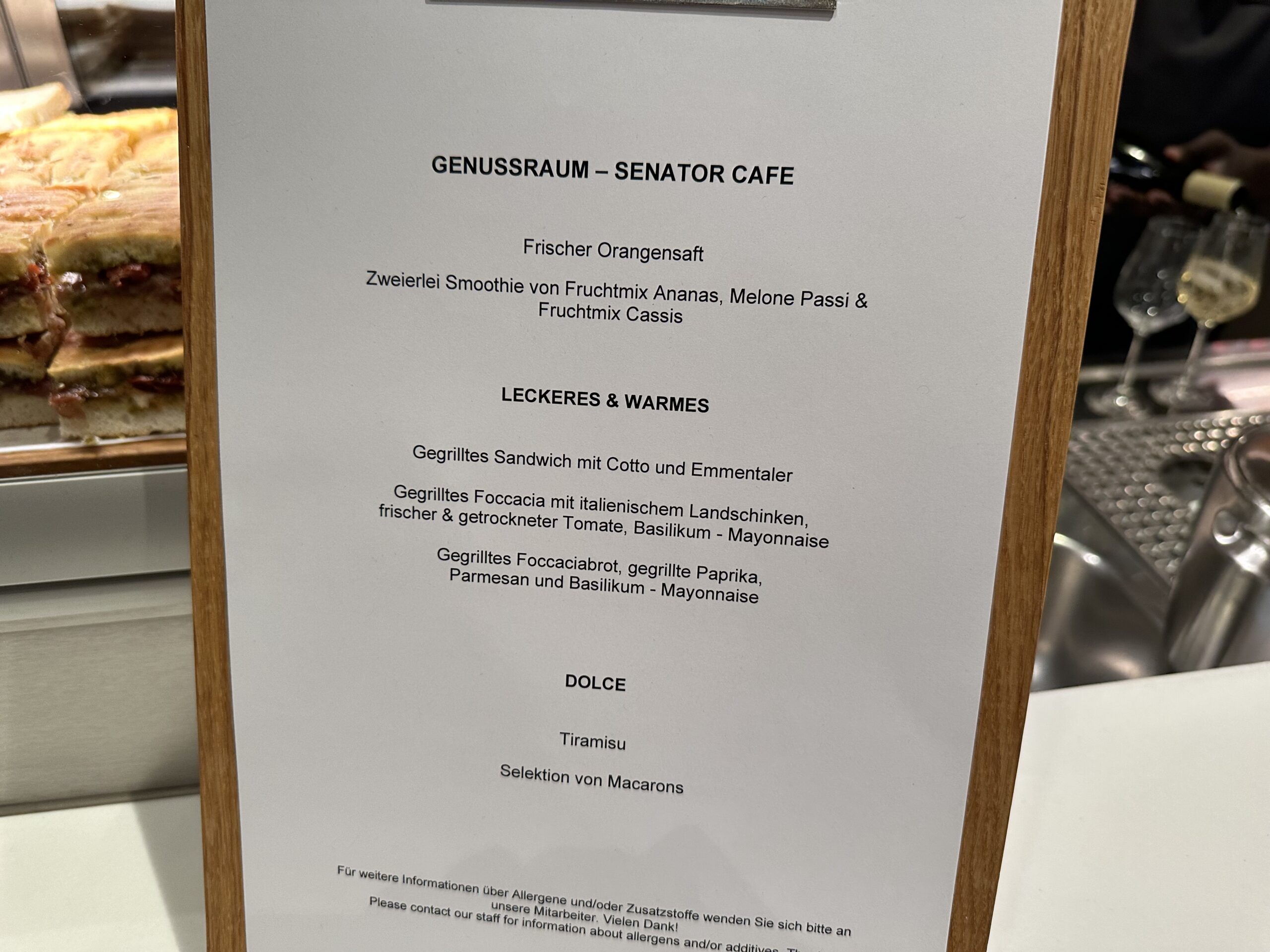 Für viele ist das Senator Café die erste Wahl, selbst einige HONs ziehen das Senator Café der First Class Lounge vor. Stammgäste werden vom Personal wiedererkannt, das Gebotene kann sich sehen lassen. Das Sortiment ist vielleicht nicht so breit wie das der klassischen Senator Lounge, dafür gibt es hier ganz andere Snacks und Getränke als in den Lounges nebenan.
