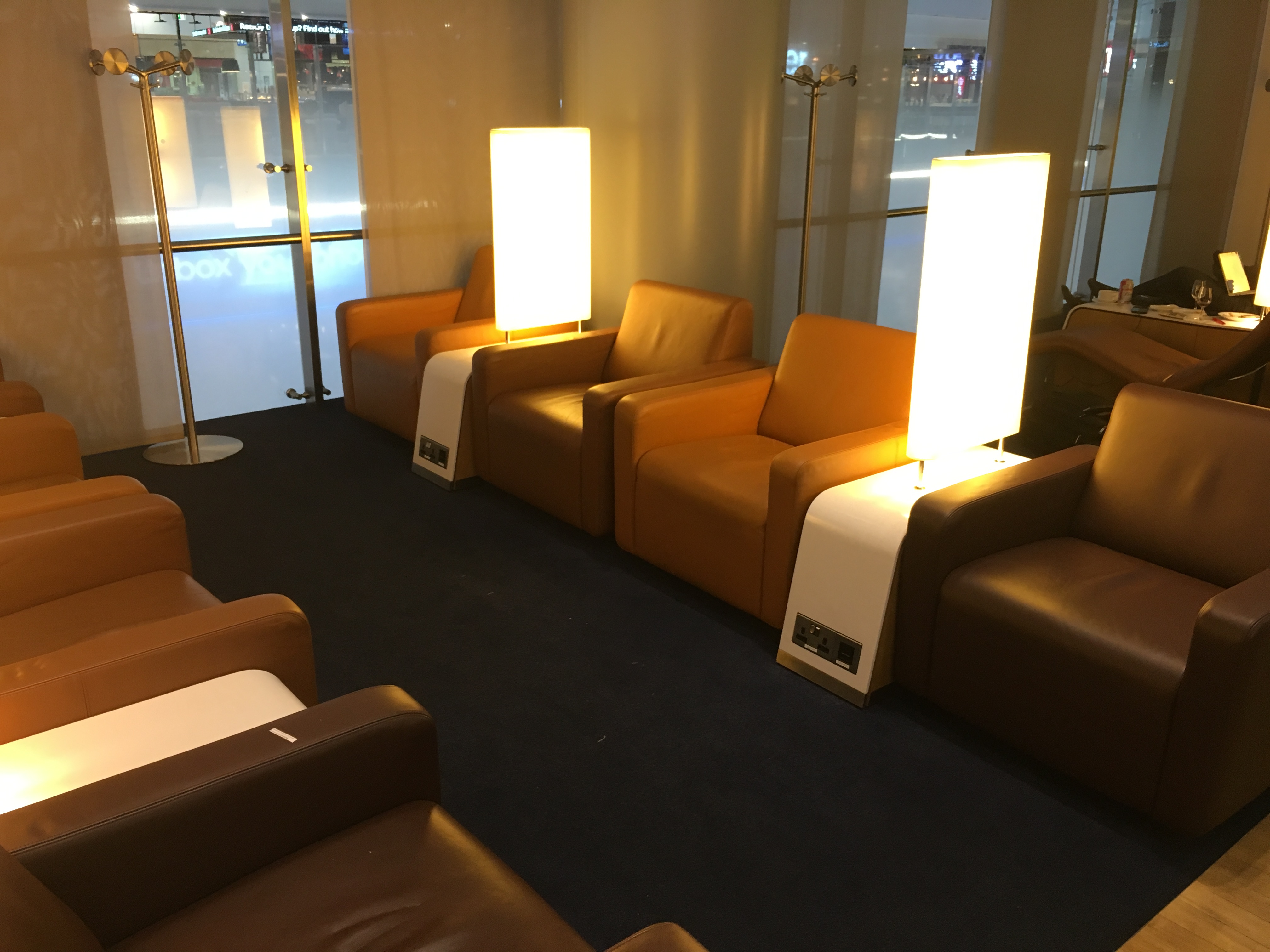 Die Lounge verfügt über die neuste Lufthansa Senator Lounge Einrichtung in gedeckten Brauntönen. Entlang der Fenster zum Terminal findet man eine Reihe von Sesseln, sowie einige Ruheliegen.