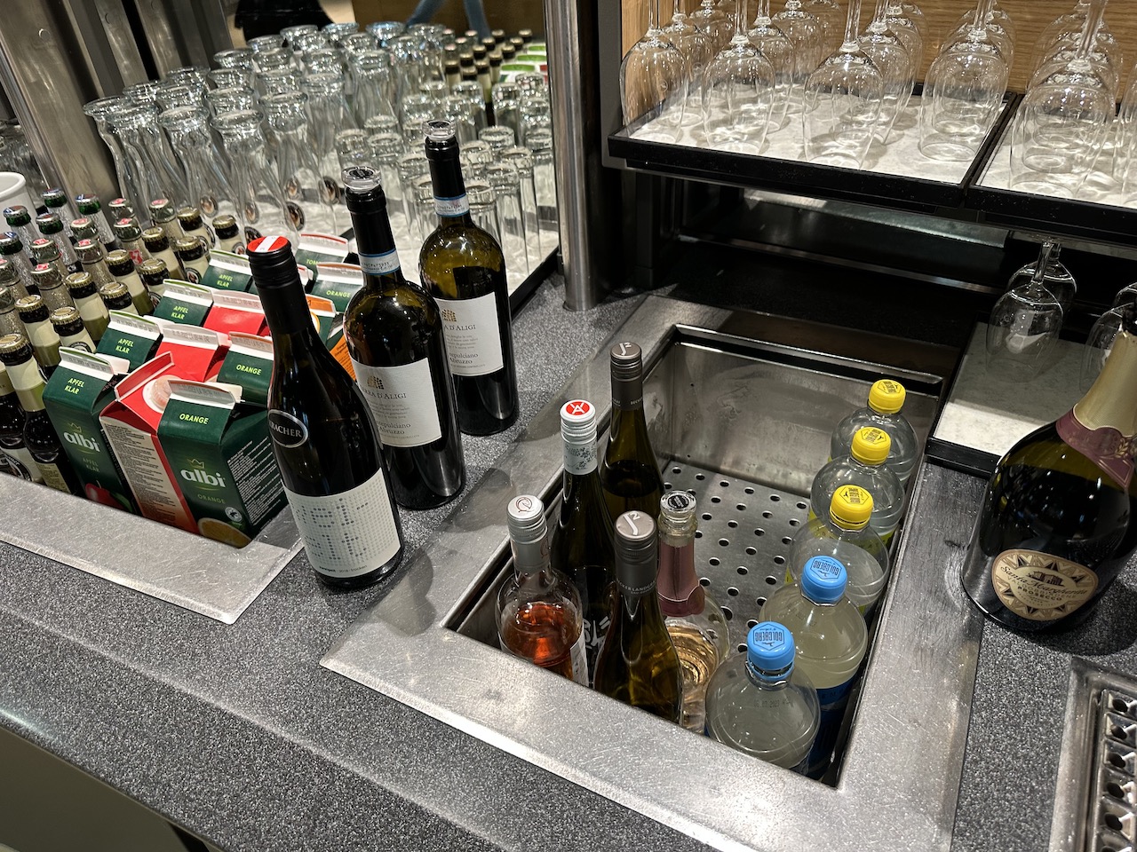 An einer Zapfanlage gibt es sowohl Softdrinks als auch Bier, darüberhinaus stehen Säfte und mehrere Wein- und Sektsorten zur Verfügung. Auch diverse Spirituosen sind zu jeder Zeit erhältlich, für Heißgetränke steht ein Vollautomat bereit.