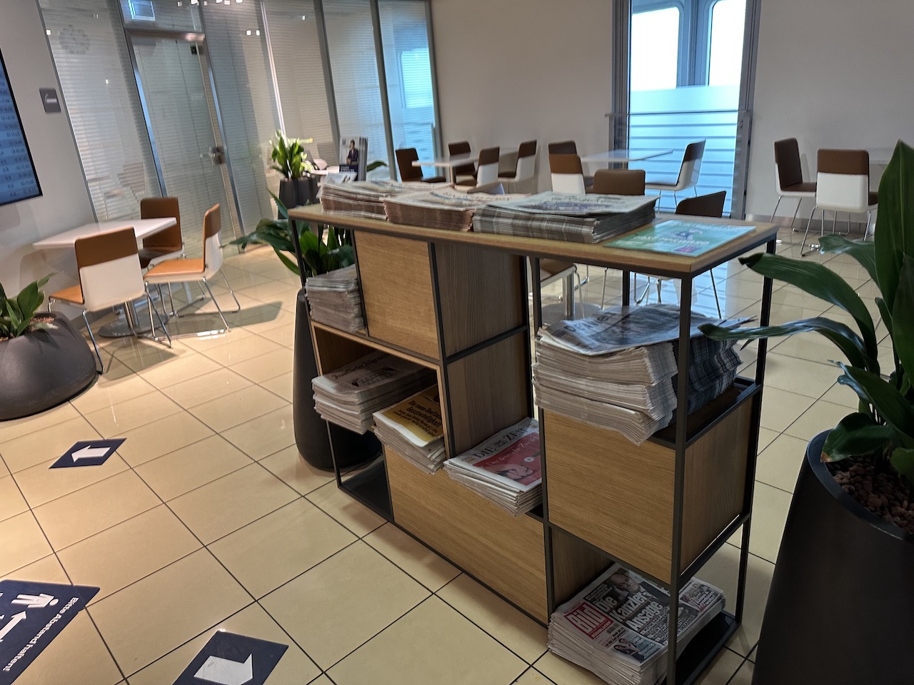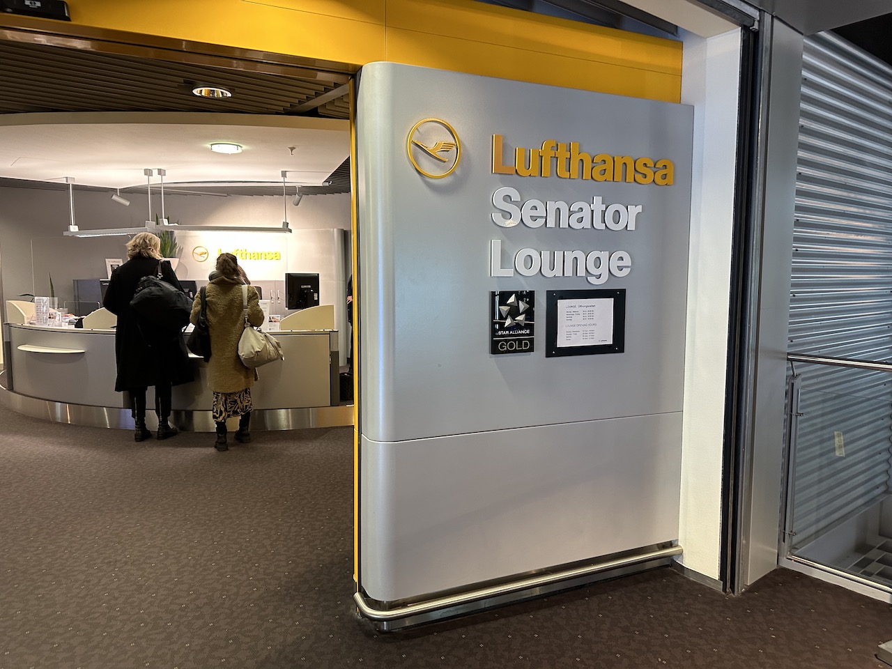 Der Zugang wird am Eingang gecheckt, dort gibt es auch Hilfestellung bei Unregelmäßigkeiten von Lufthansa Flügen. Nach einem netten Smalltalk mit den beiden Damen haben wir uns noch mit Zeitschriften versorgt die am Tresen ausliegen.