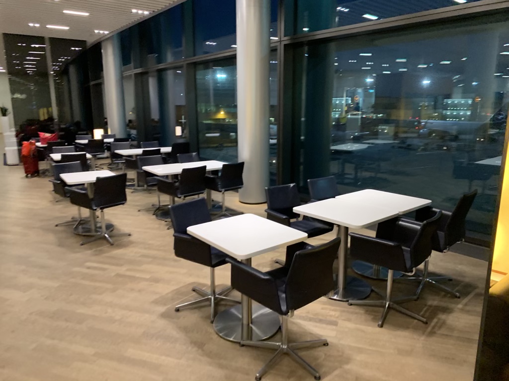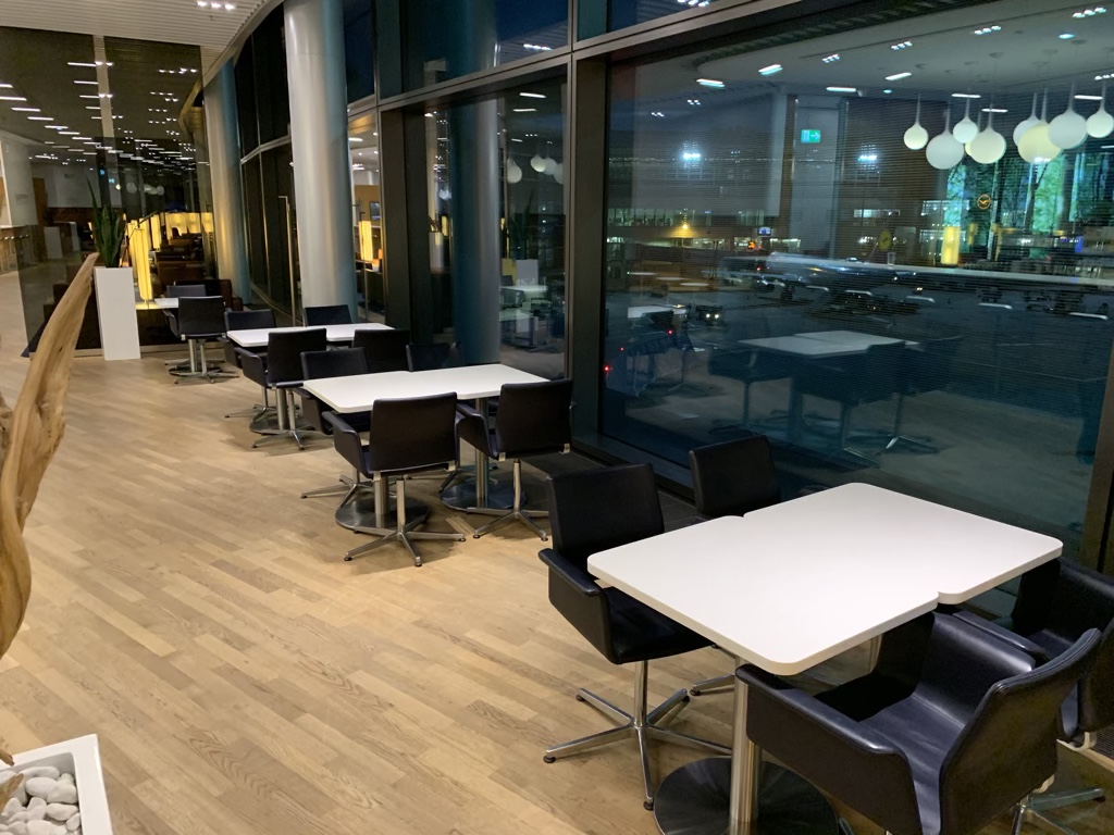 Ganz vorne in der Lounge befindet sich neben dem großen Buffetbereich auch der Bistrobereich. Hier kann man an einigen Hochtischen mit Barstühlen sowie richtigen Tischen und Stühlen ein wenig essen. Auch zum Arbeiten werden diese Tische gerne verwendet.