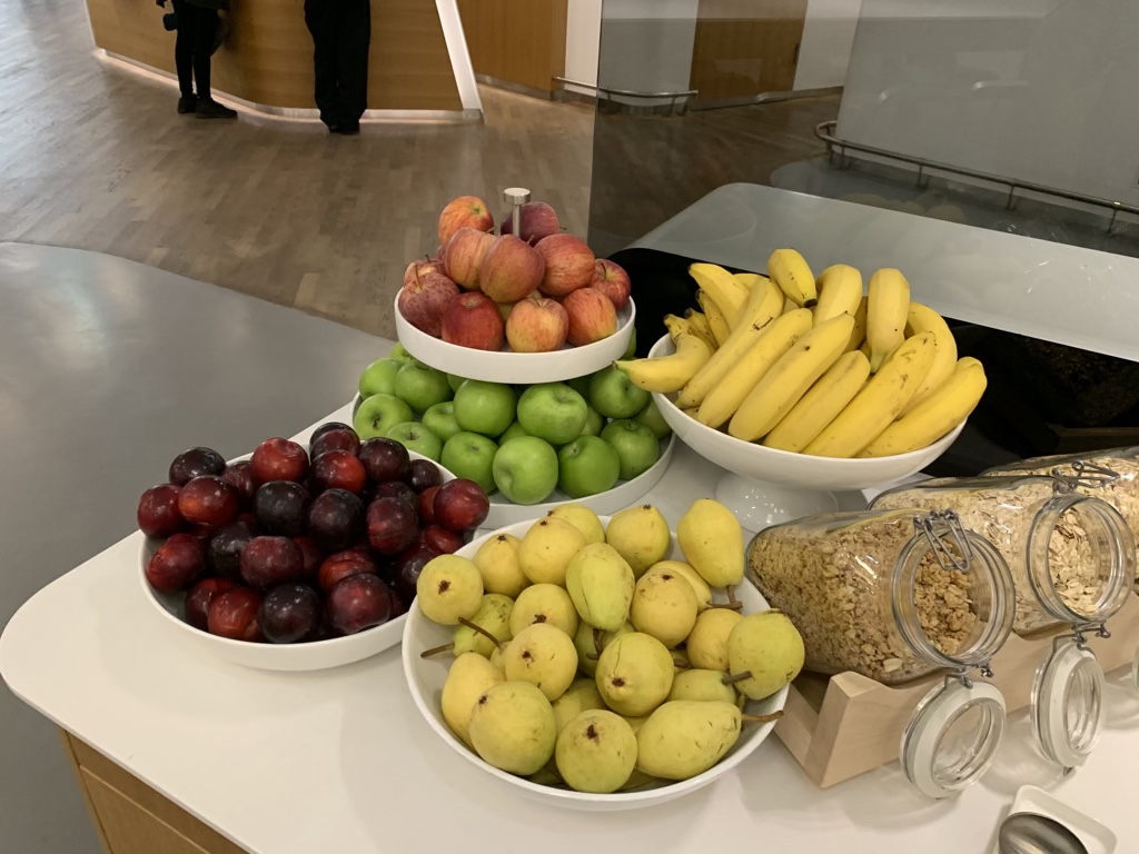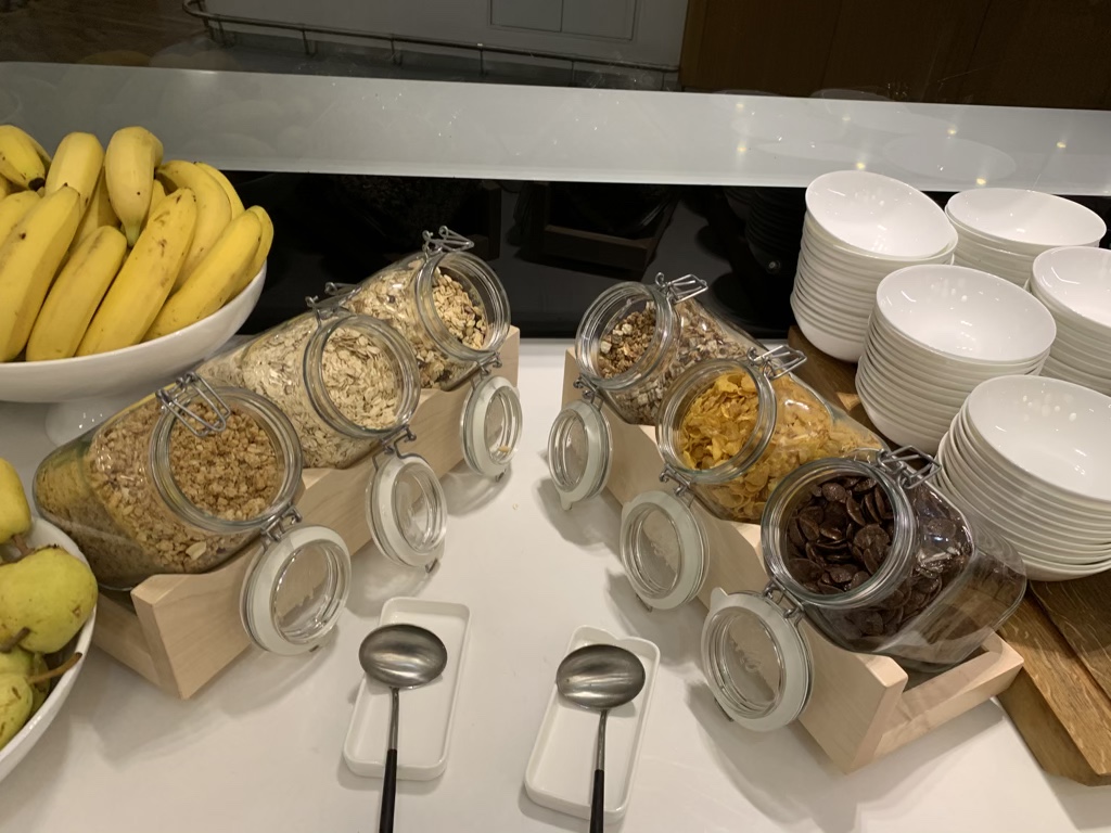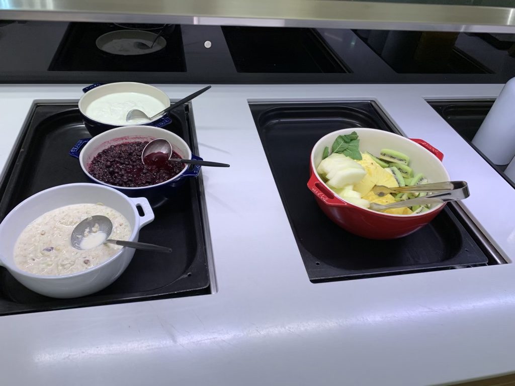 Ich habe die Lufthansa Senator Lounge Z am Morgen besucht und entsprechend wurde in der Lounge auch Frühstück serviert. Hierbei gibt es morgens eine große Auswahl an Frühstücksspeisen mit warmen und kalten Optionen, Obst, Müsli, Joghurt und Früchten.
