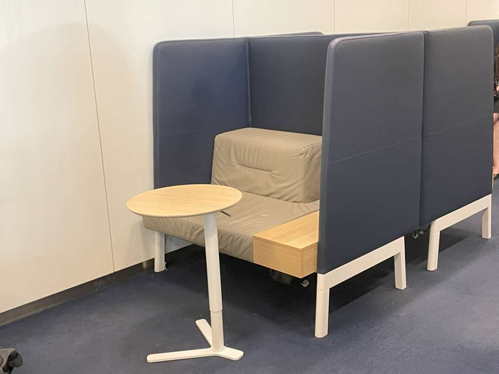 Ich passierte zunächst den Service Desk. Im Vergleich zum Eingang grüßten hier die Mitarbeiter noch freundlich und in deutscher Sprache. Gegenüber vom Service Desk befindet sich ein Zeitschriftenregal. Dahinter bieten sich schon mehrere Optionen: Entweder Ihr setzt Euch rechter Hand an einen der Arbeitsbereiche oder geht links zu den Toiletten und Duschen.
