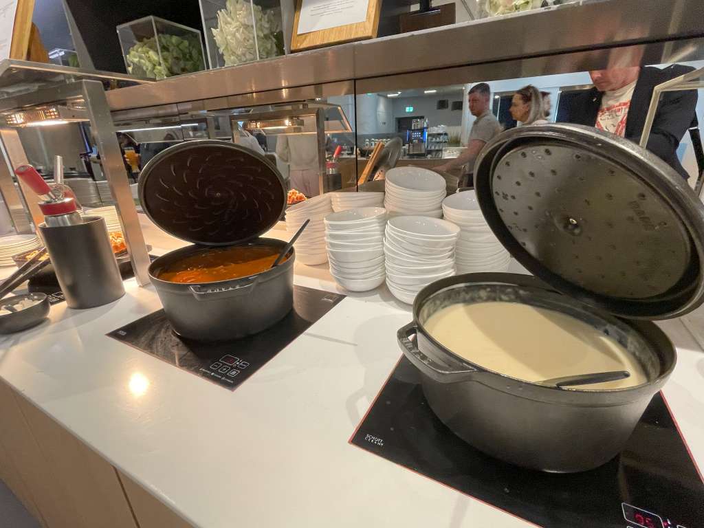 Kein kulinarischer Höhepunkt, aber eine breite Auswahl an Speisen, die jedem Geschmack etwas bieten dürften – so wirkte zumindest für mich das Essensbuffet in der Lufthansa Senator Lounge in Frankfurt. Im vorderen Teil befindet sich ein großzügiges Buffet mit vielen Optionen zur Selbstbedienung.