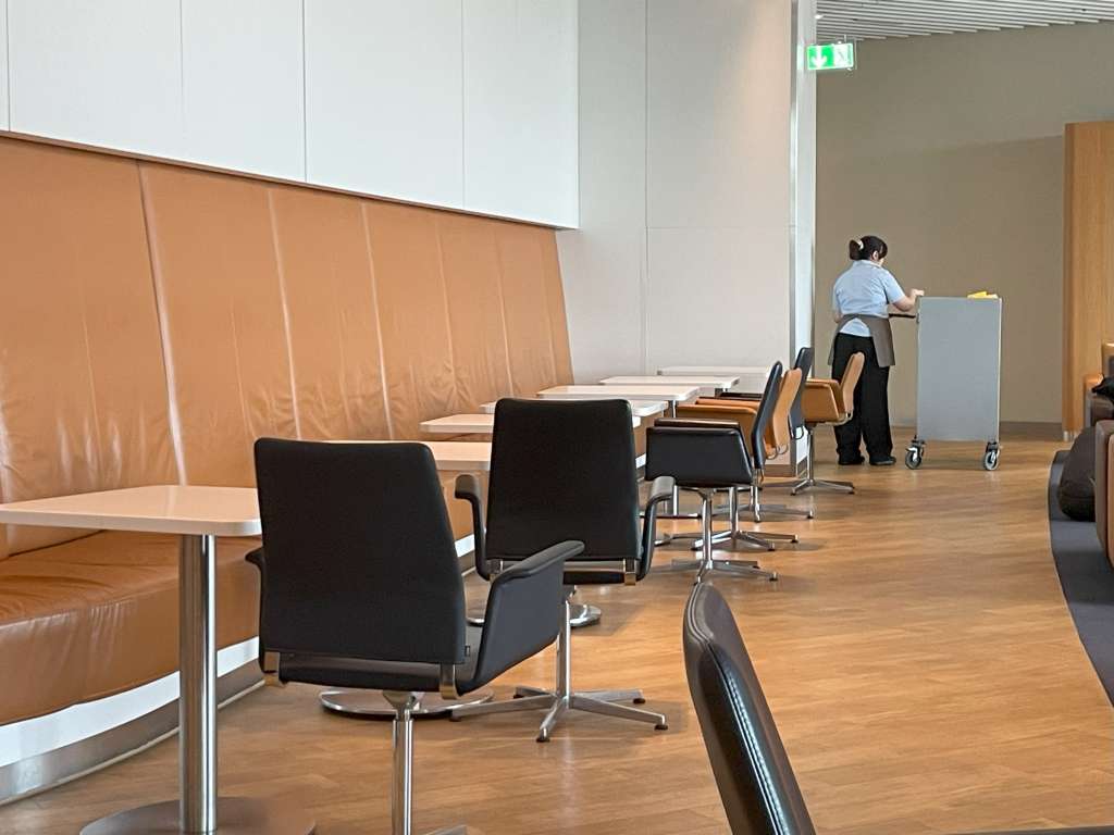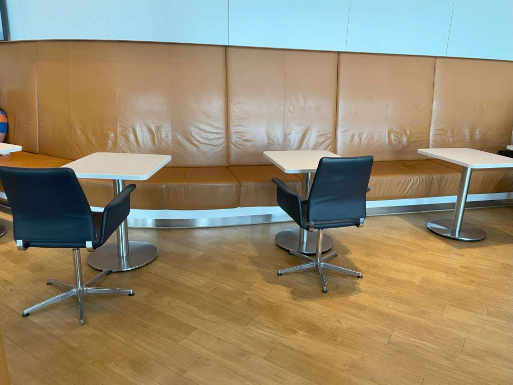 Mich zog es nach einem kurzen Zwischenstopp auf der Toilette weiter geradeaus, wo sich zunächst diverse Buffet-Stationen befinden. Während sich im rechten Bereich einige Lounge-Sessel befinden und daran anschließend sogar gut versteckt ein Ruheraum liegt, fand ich im Hauptbereich diverse Sitzgelegenheiten – vom Ledersessel bis zum Arbeitstisch für mehrere Personen. Am Ende der Lounge befinden sich insgesamt sieben braune Ledersofas, die zum Entspannen einladen. In der rechten hinteren Ecke gibt es sogar eine Raucherkabine.