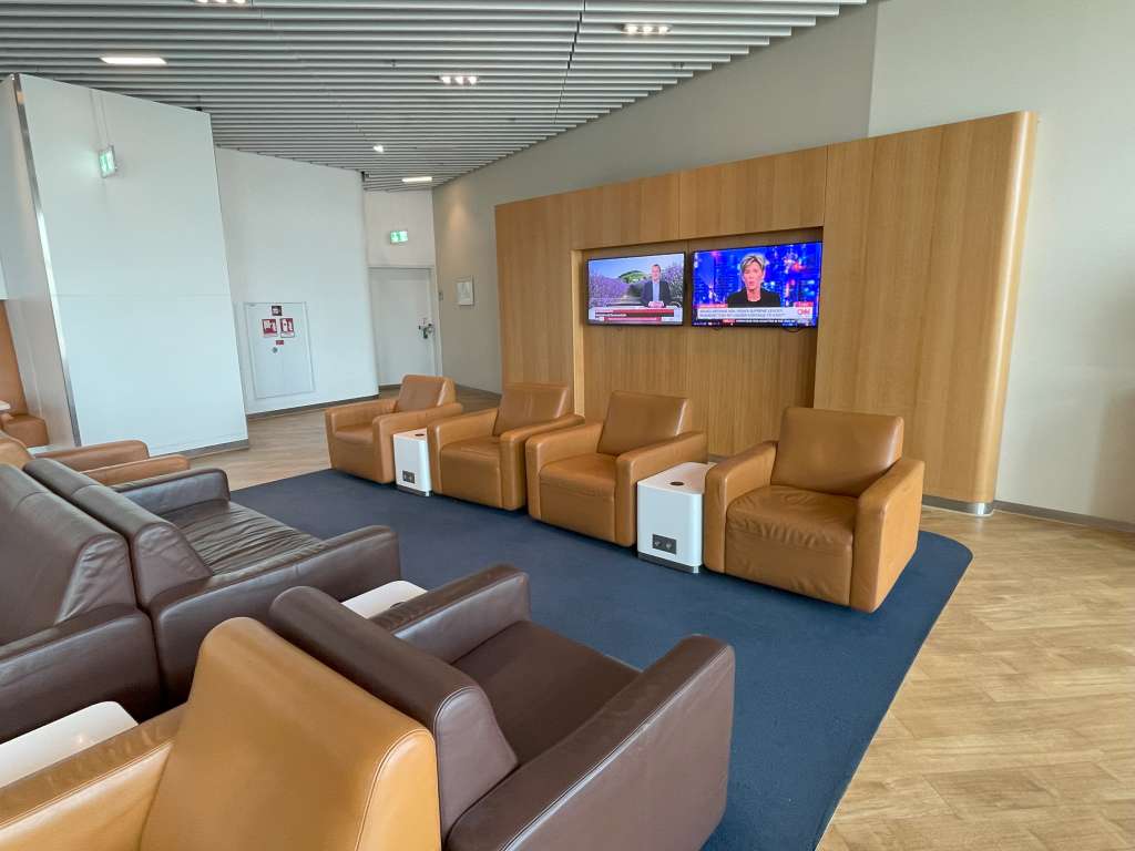 Vom Hauptbereich der Lounge konnte ich direkt auch einen Blick auf das Vorfeld erhaschen. Mit Blick nach draußen gibt es zahlreiche weitere bequeme Sitzmöbel. Hier konnte ich eine 180-Grad-Wende machen und im hinteren Bereich der Lounge zunächst einen gemütlichen Platz finden. Praktisch, denn hier befindet sich sowohl eine Anzeige mit den Abfluginformationen als auch mehrere Fernseher mit den aktuellsten Nachrichten.