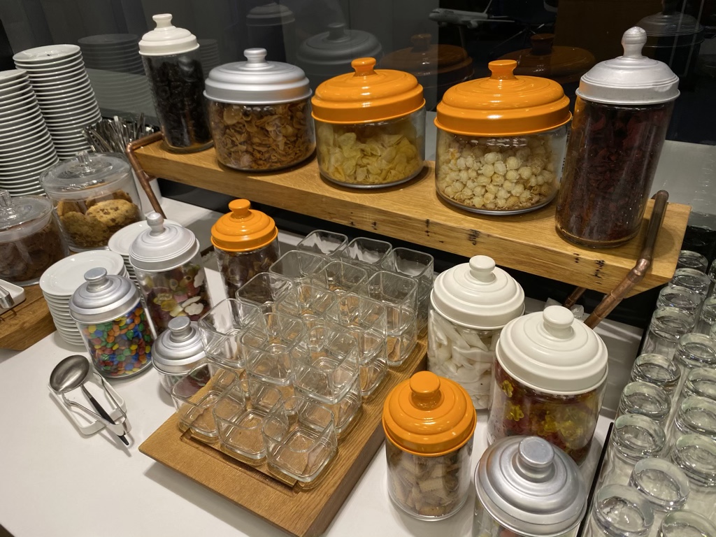 Wenn man weiter in die Lounge hinein läuft, ändern sich die Sitzmöbel. Aus Tischen und Stühlen werden gemütliche Sessel. Toll hierbei ist, dass an nahezu jedem Sessel Stromanschlüsse vorhanden sind. Auf der rechten Seite im hinteren Bereich befinden sich Ruheliegen, die aber in keinem separaten Raum sind. Auch im hinteren Teil der Lounge befindet sich nochmal ein kleines Buffet, an dem vor allem Süßigkeiten, Tee und Kaffe angeboten werden.