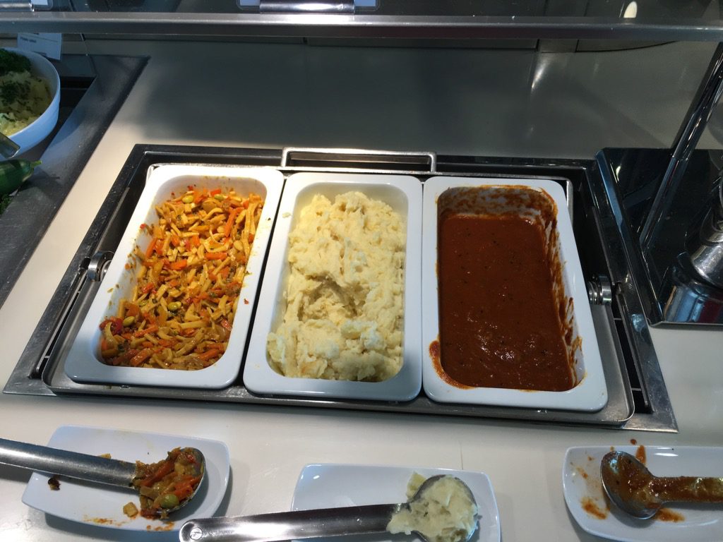 Lufthansa typisch gab es ein kaltes Buffet mit verschiedenen Salaten, Wurst und Käse, sowie verschieden Brötchen und Broten. Auch drei warme Optionen standen auf dem Buffet bereit. Zum Dessert gab es eine Créme und Berliner. Das Angebot an Speisen war hiermit recht überschaubar, allerdings ausreichend.