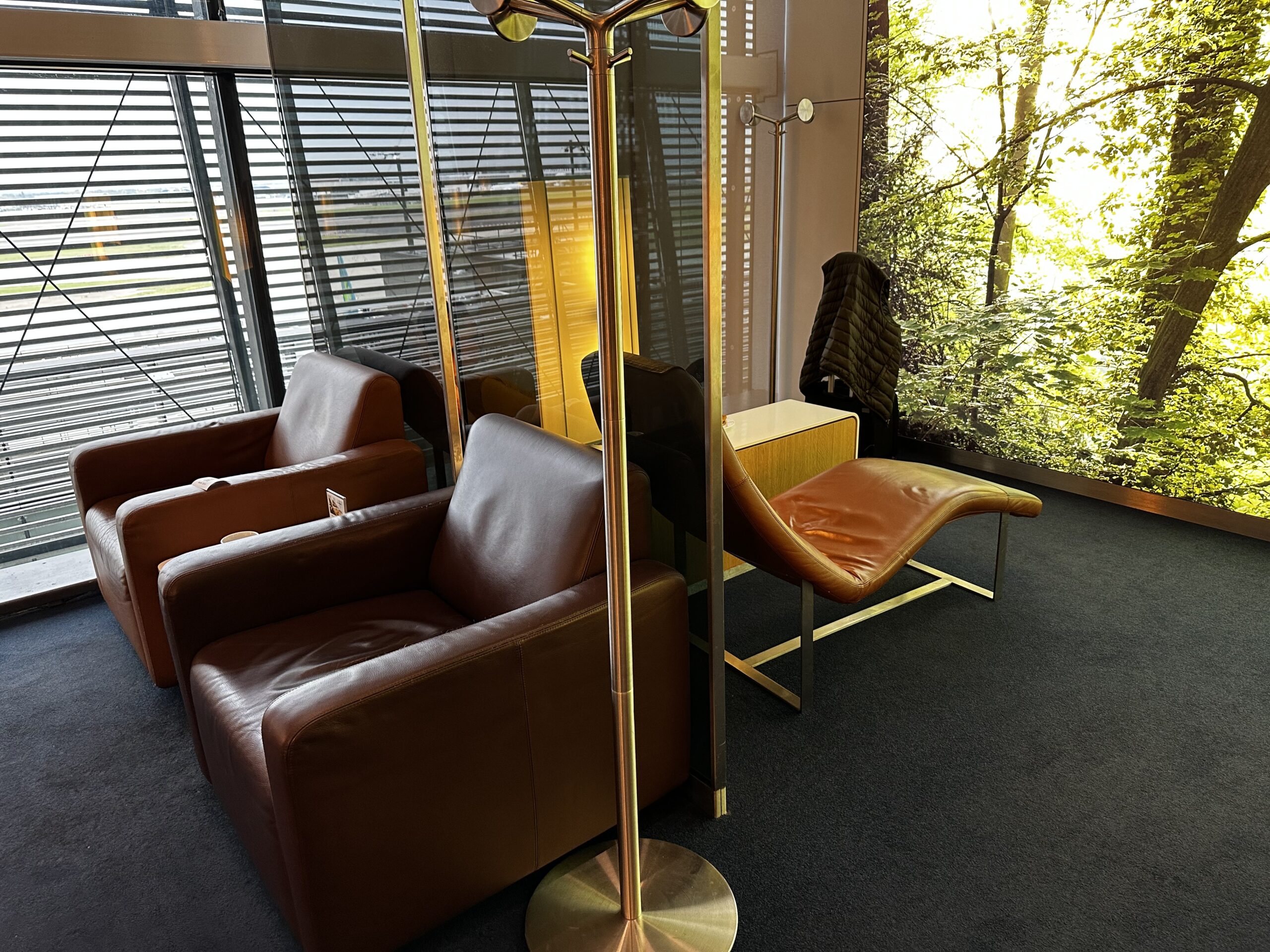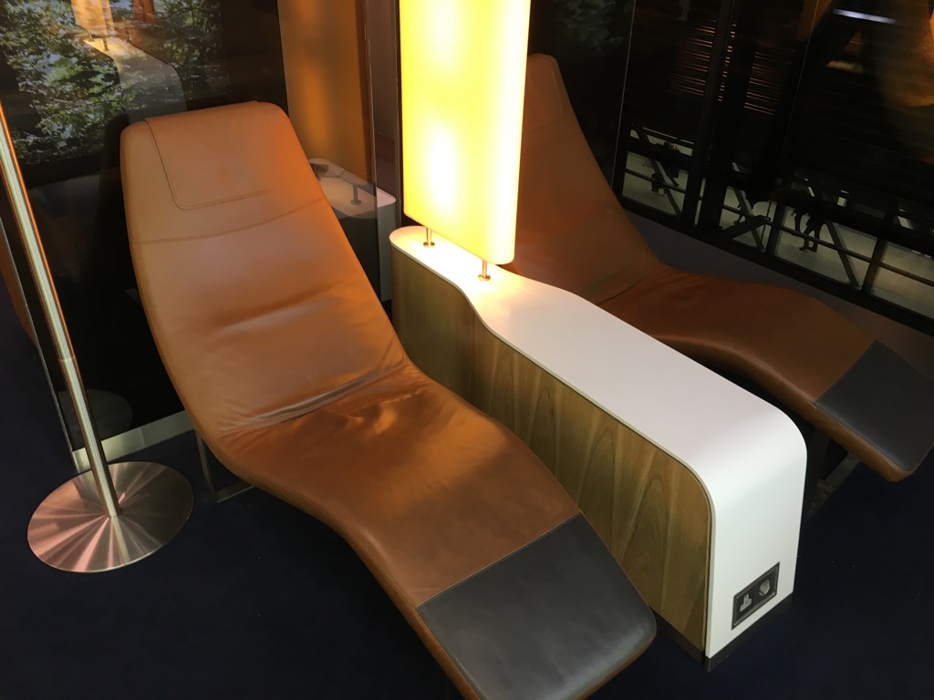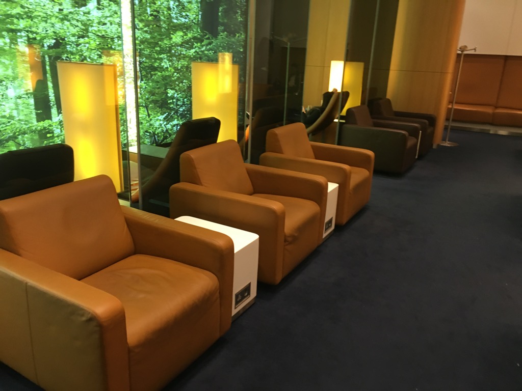 Im hinteren Teil der Lounge befand sich der eigentliche Lounge Bereich, mit Sesseln in verschiedenen Sitzgruppen und einigen Ruheliegen. Durch die großen Panoramafenster kommt viel Licht in die Räumlichkeit, zum Teil kann man das Vorfeld etwas beobachten.
