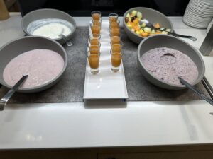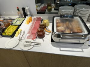 Das Angebot gleicht in etwa dem der Lufthansa Business Lounge, zum Frühstück gab es Müsli, Obst, Backwaren, Aufschnitt und warme Speisen.