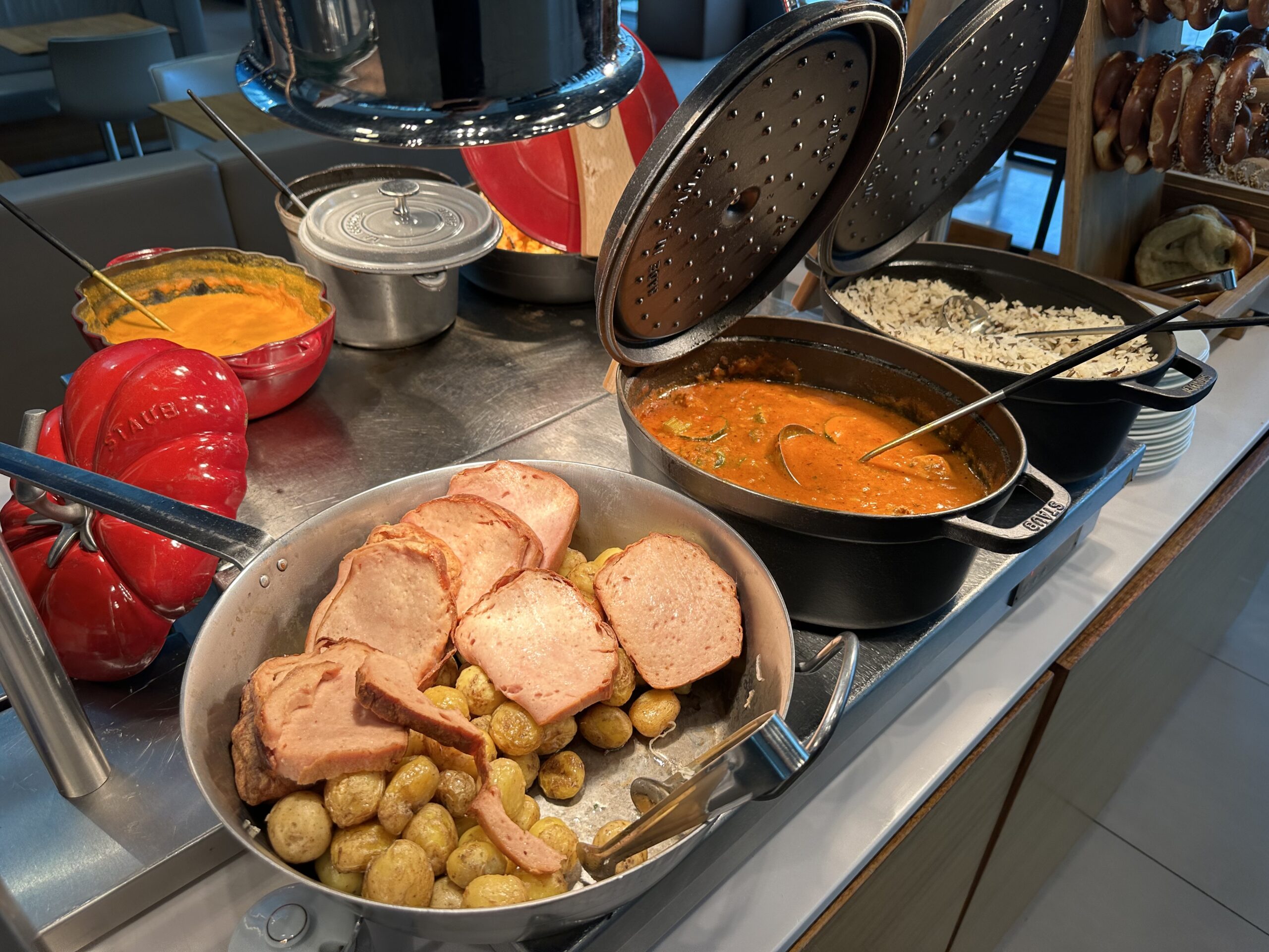 Zur Wahl steht das übliche Sortiment an kalten Snacks, Salaten, Suppe und warmen Optionen. Heute gab es u.a. Leberkäs und Curry mit Reis. Dazu gibt es Brot und Brezeln sowie verschiedene Nachspeisen und im Sommer auch Eis.