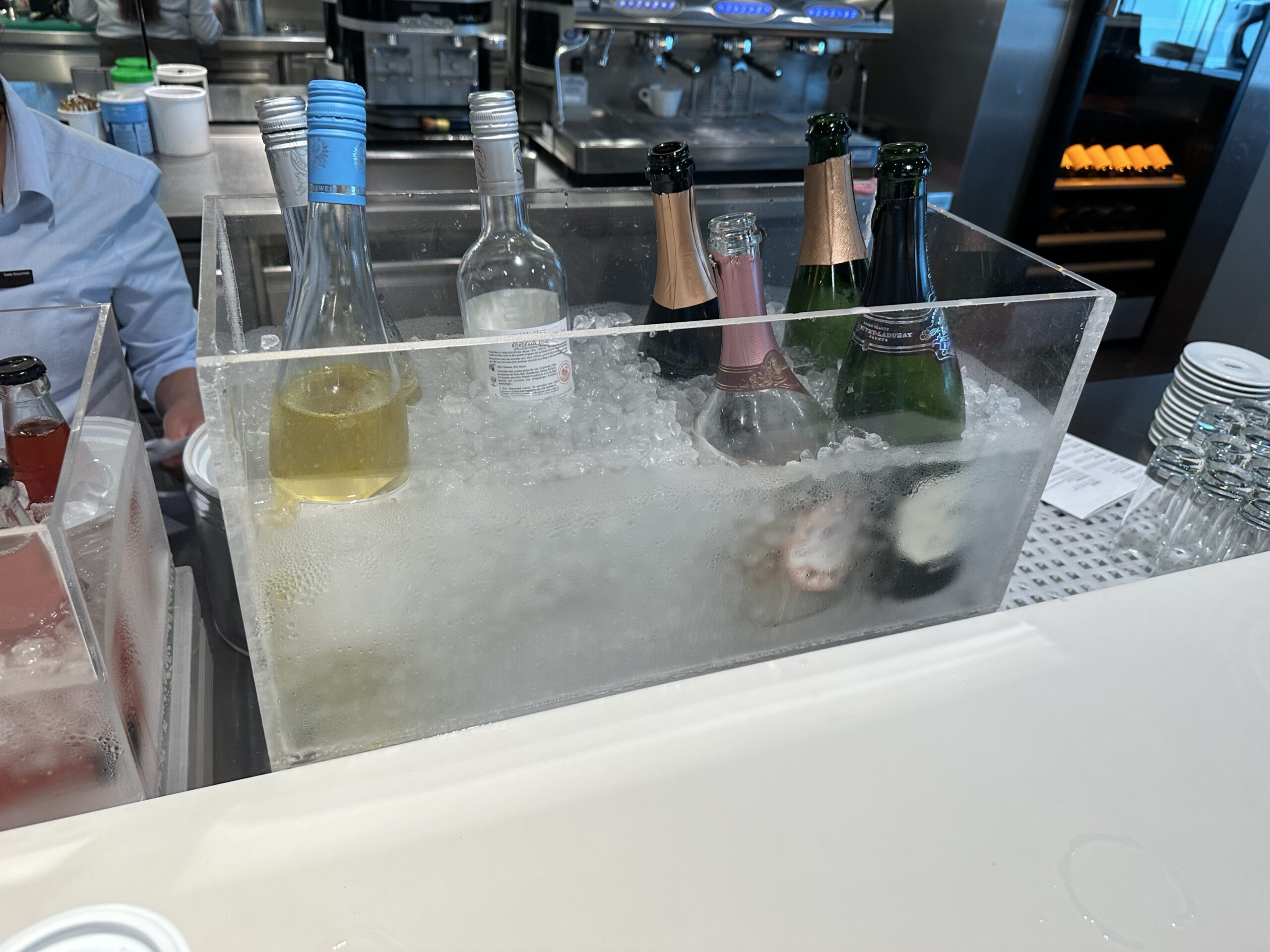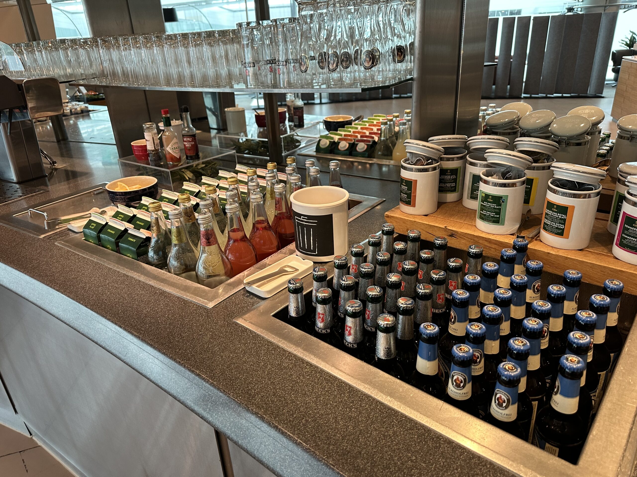 Die Getränke stehen zur Selbstbedienung, im Sortiment sind auch alkoholische Drinks wie Bier, Wein, Sekt und Spirituosen. Wer möchte, kann sich Bier frisch zapfen oder zur Bar gehen und sich das gewünschte Getränk bestellen.