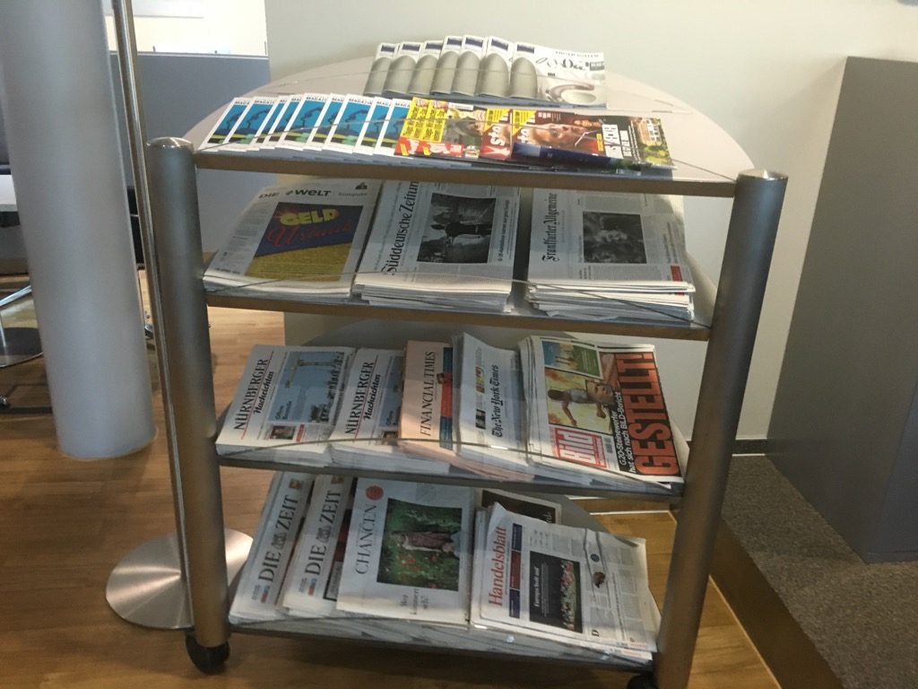 Auch einige Magazine und Tageszeitungen gibt es in der Lounge, was ich seit dem Wegfall der Magazine auf der Kurzstrecke auch immer wieder sehr zu schätzen weiß.