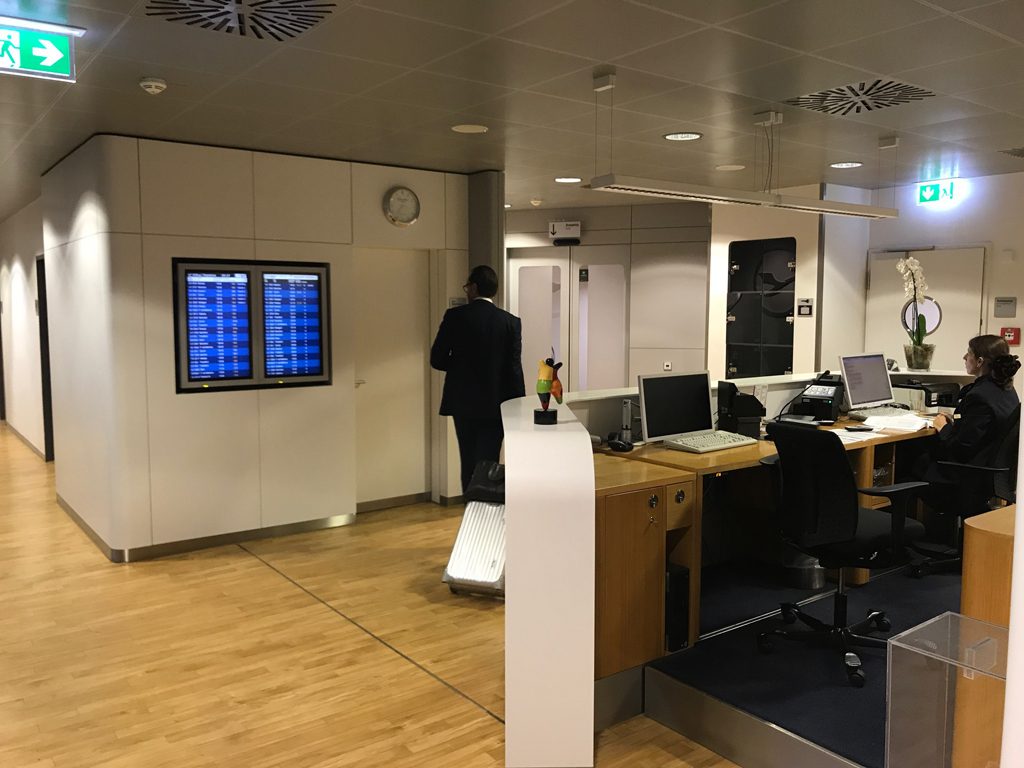 Im Eingangsbereich der Lounges befindet sich die Rezeption sowie zwei Informationsbildschirme, die über aktuelle Abflüge informieren. Kunden der Business Lounge biegen nach rechts ab, der Eingang der Senator Lounge liegt auf der linken Seite der Rezeption. Auch Zeitungen und Zeitschriften (in Papierform) sind hier kostenlos erhältlich.
