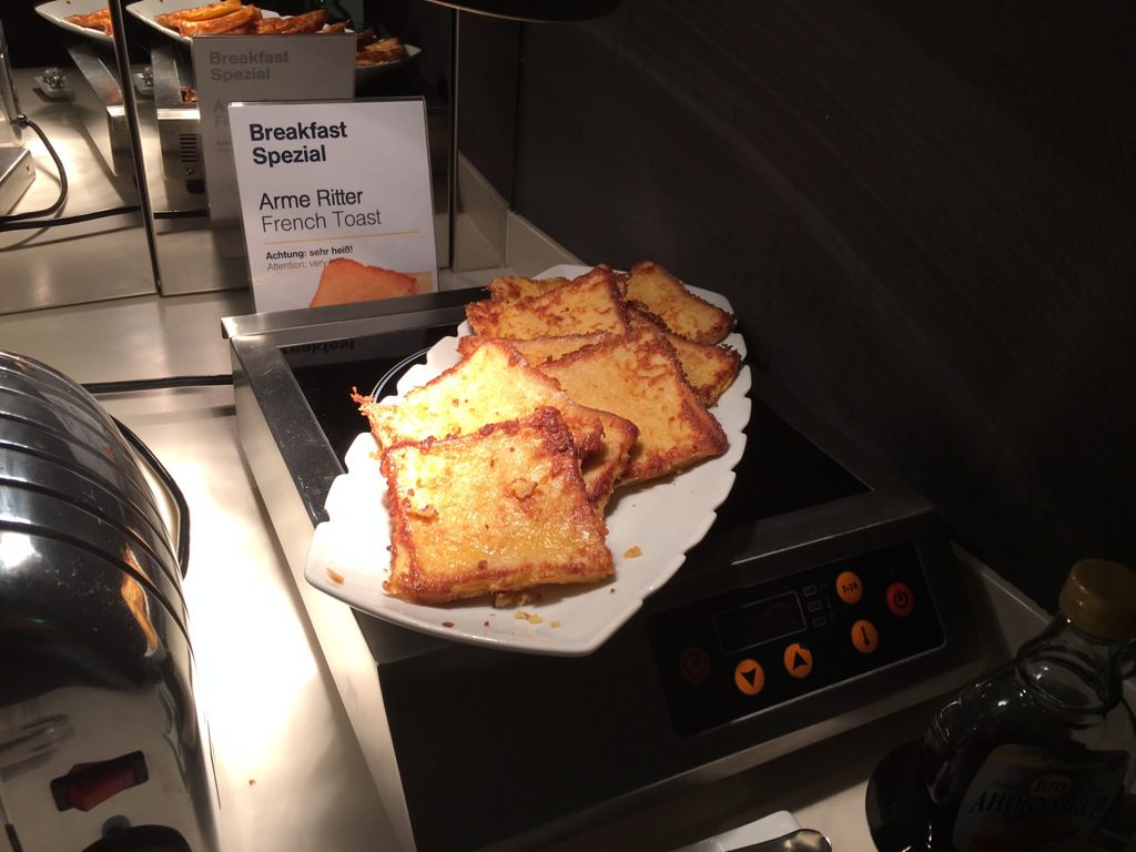 Auf dem Buffet wird bis Mittags um 13 Uhr warmes und kaltes Frühstück angeboten. Neben verschiedenen Sorten an Wurst und Käse, findet man auch verschiedene Brotaufstriche, Fruchtsalat, Joghurt, Müsli, sowie natürlich eine große Auswahl an Brot, Brötchen und Croissants.