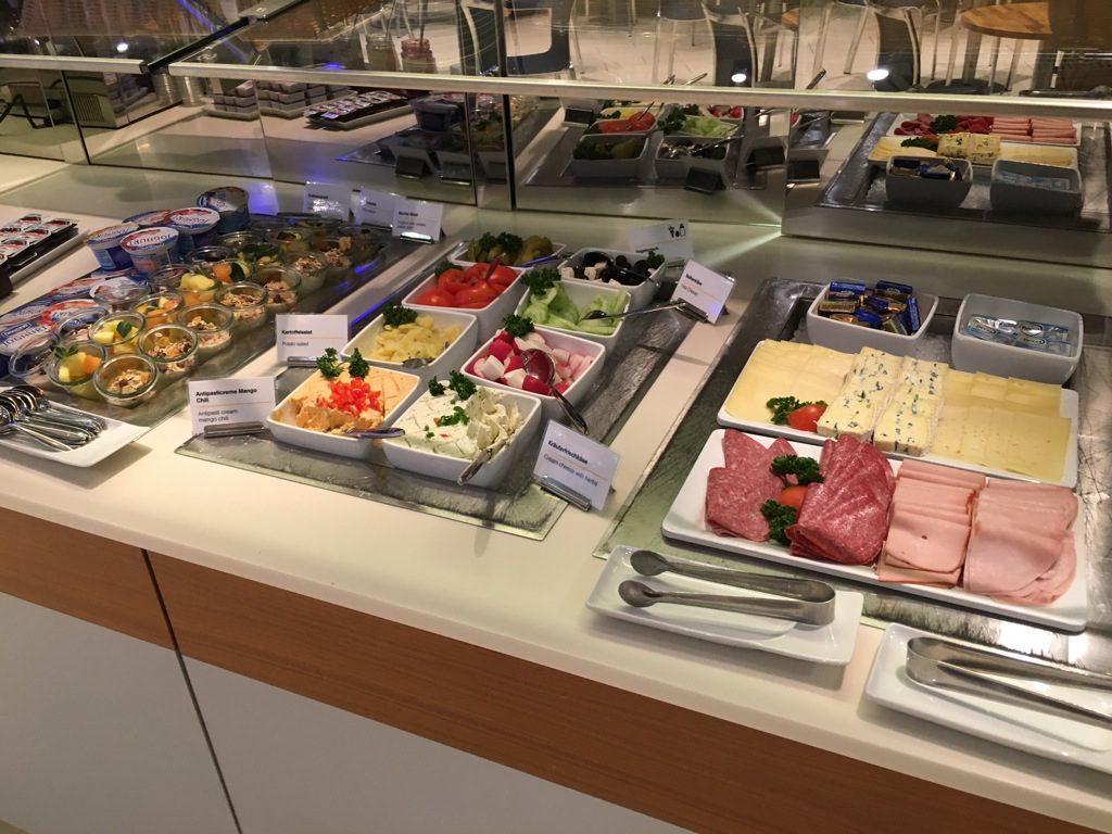 Im Zentralbereich der Lounge befindet sich der Bistrobereich mit vielen Stühlen und Tischen. Auf einem Buffet wird bis zum Schließen der Lounge um 13 Uhr warmes und kaltes Frühstück angeboten.