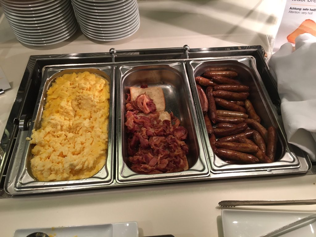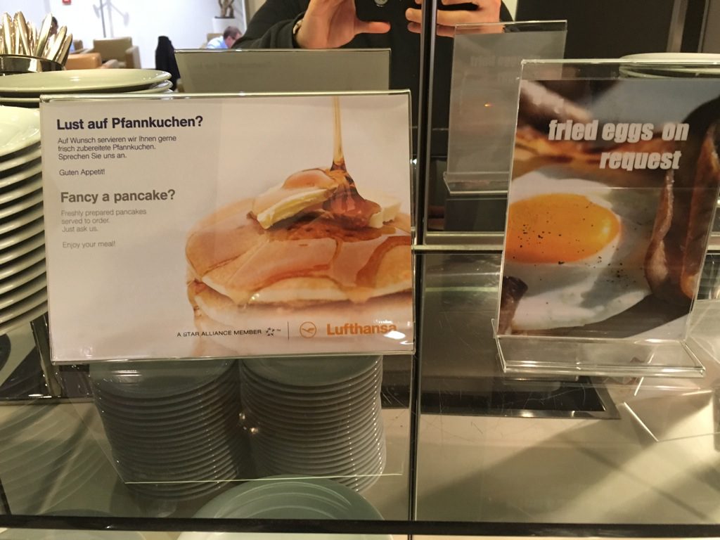 Besonders das Angebot an warmen Speisen ist für eine Lufthansa Business Lounge sehr beeindruckend. Neben Rührei, Speck, Würstchen und French Toast auf dem Buffet, kann man sich auch frische Pancakes und Spiegeleier zubereiten lassen.