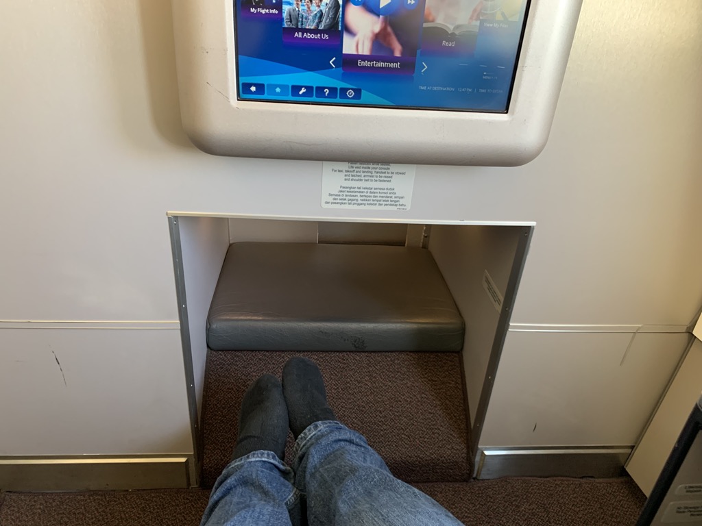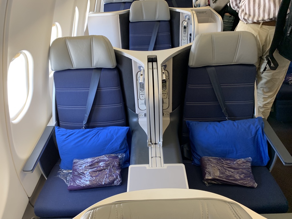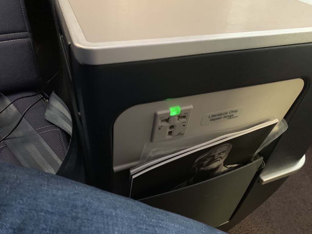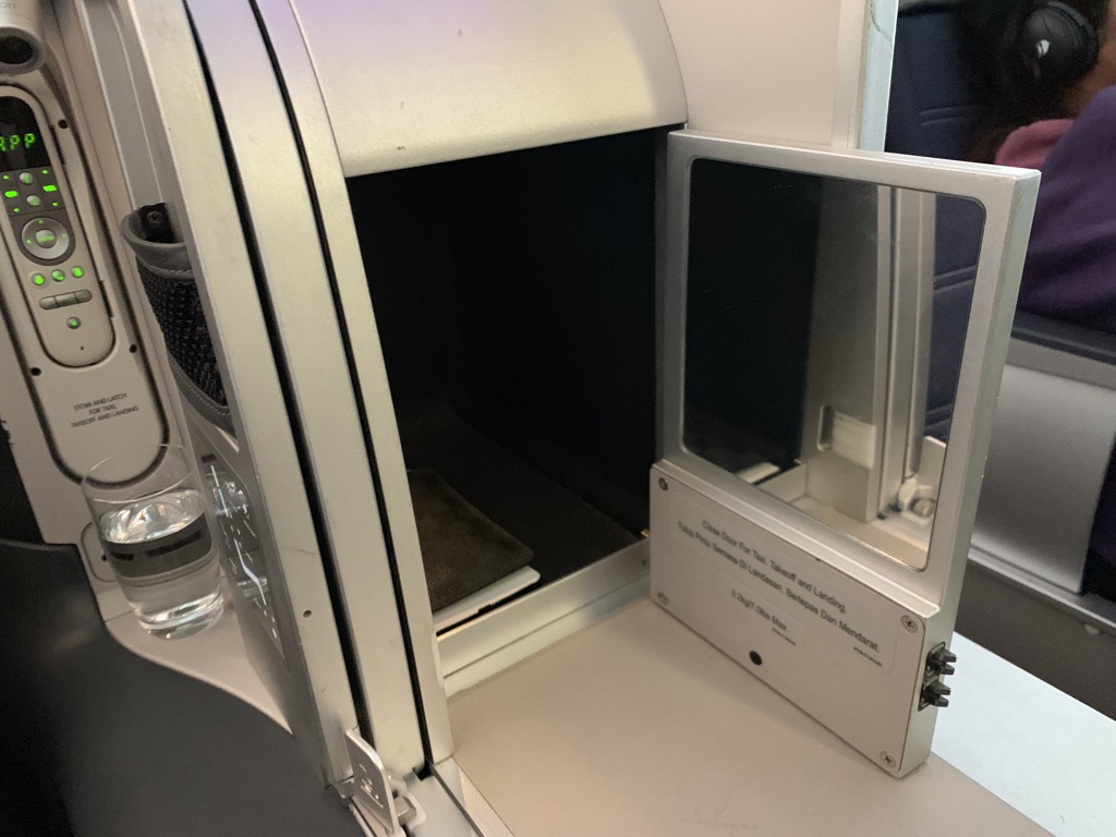 Ich habe mich für Platz 1K entschieden, was eine wirklich gute Wahl war und in meinen Augen auch der beste Sitzplatz im Flugzeug. So hat man auf diesem „Thron Sitz“ links und rechts neben dem Sitz zwei riesige Ablageflächen und auch das Fußfach ist angenehm groß. Die Nähe zur Bordküche kann etwas störend sein, allerdings hat es mich auf diesem Flug überhaupt nicht gestört.