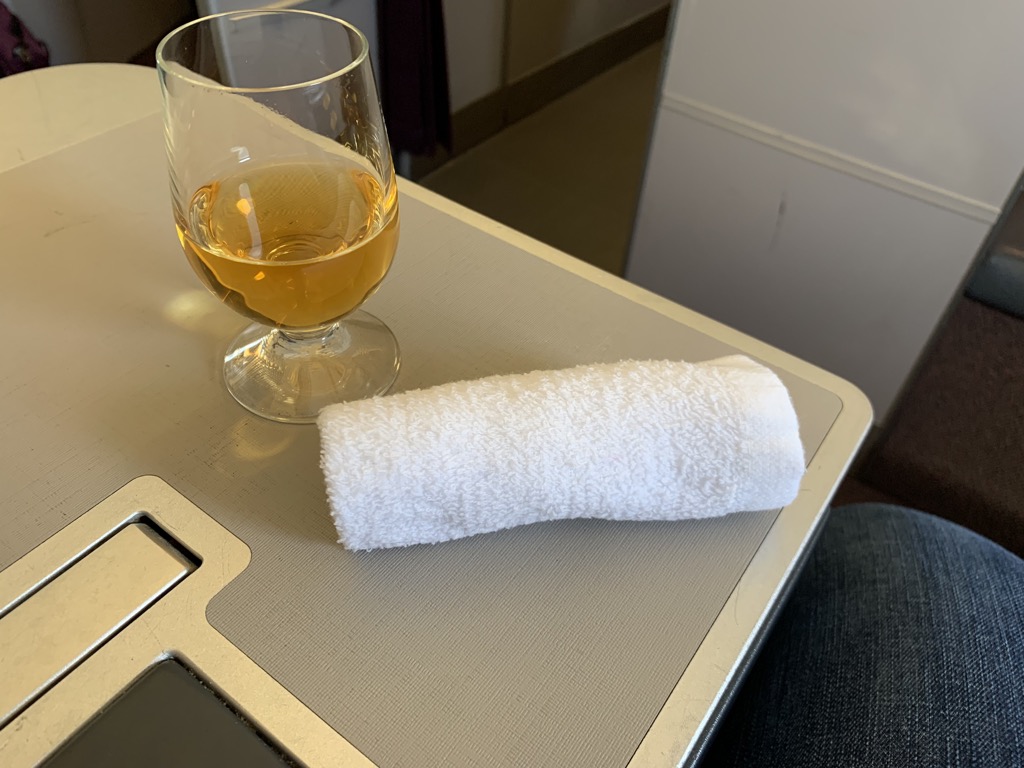 Zu Beginn des Fluges wurde ein Welcome Drink angeboten. Hier hatte man nur Wasser und Apfelsaft auf dem Tablett, allerdings hätte man auch andere alkoholfreie Getränke aus der Küche geholt. Mir wurde gesagt, dass man Alkohol am Boden mit geöffneter Tür nicht servieren könne. Dies ist vermutlich eine Sparmaßnahme, denn wenn man am Boden Alkohol ausschenkt, wird dieser auch besteuert.