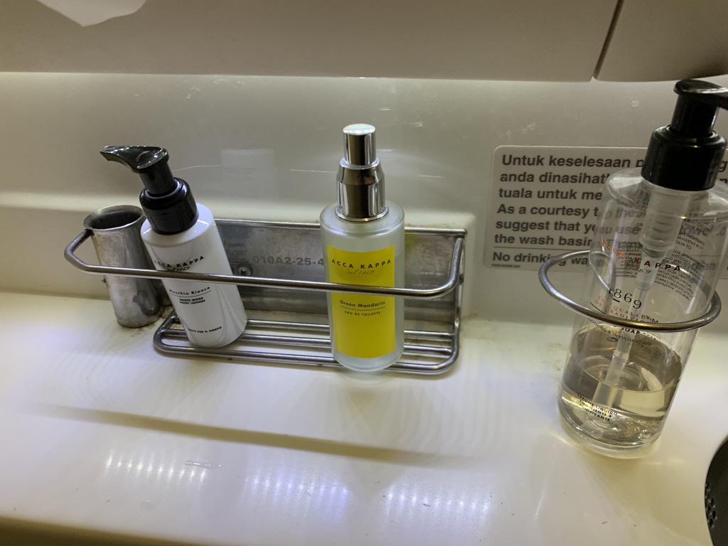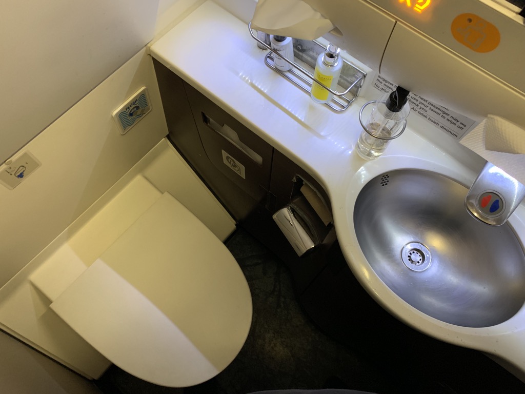 Für die Business Class gab es drei Toiletten, wobei sich eine im vorderen Bereich der Kabine befand und zwei weitere im hinteren Bereich. Ein wenig eigentümlich hier war, dass man durch eine mini Economy Class Kabine mit zwei Reihen gehen musste.