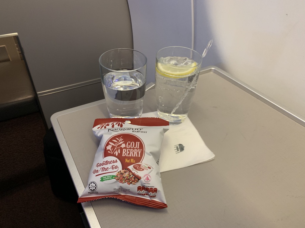 Keine 15 Minuten nach dem Start haben die Flugbegleiter auch schon mit dem Service begonnen und einen Getränkewagen durch die Kabine geschoben. Zu den ersten Getränken gab es auch abgepackte Goji Beeren. Bei einem Gin&Tonic und einem Wasser habe ich es mir erst einmal gemütlich gemacht.