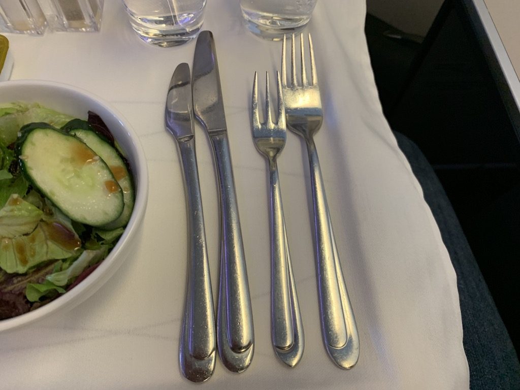 Kurze Zeit später wurde mir ein Salat als Vorspeise serviert. Auf dem Tablett befand sich auch schon das Dessert für den Flug. Ich war etwas überrascht, dass man mir das Essen samt Abdeckung präsentiert hat, allerdings hat man mir direkt nach meinem Bild das Tablett noch einmal weggenommen, sich entschuldigt und die Abdeckung vom Salat entfernt. Ob dies nun daran lag, dass ich ein Foto gemacht habe oder ob man es wirklich einfach vergessen hatte kann ich nicht sicher sagen, allerdings hat man den anderen Passagieren auch die Plastikabdeckungen von den Speisen entfernt.