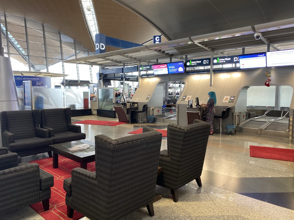 Aufgrund Christophs Status konnten in der Business Suite von Malaysia Airlines einchecken. Dies ist ein separater Check-In Bereich links im Flughafen. Hier wurden wir sehr zügig und freundlich eingecheckt und uns wurden die Bordkarten überreicht. Ebenso wurde uns der Weg zu den Lounges erklärt. In der Golden First Class Lounge verweilten wir nur sehr kurz, da es dort extrem kalt war. Nach dem Aufenthalt in der zweiten Lounge, der Cathay Pacific Lounge, machten wir uns auf den Weg zum Gate, wo pünktlich das Boarding begann.