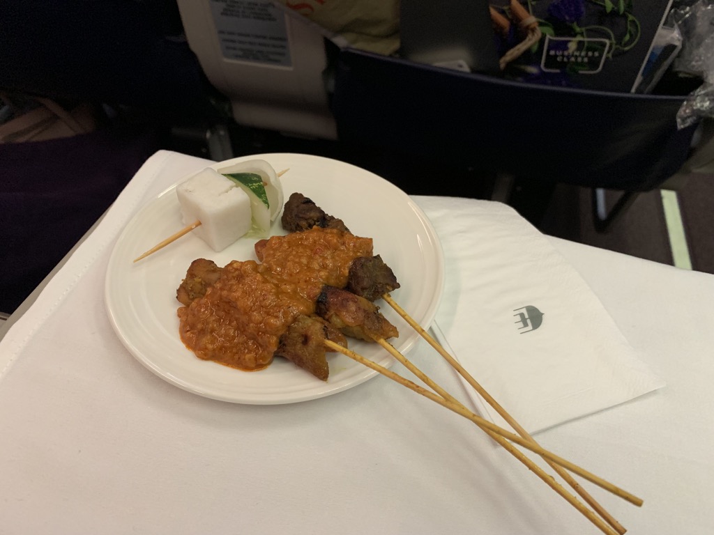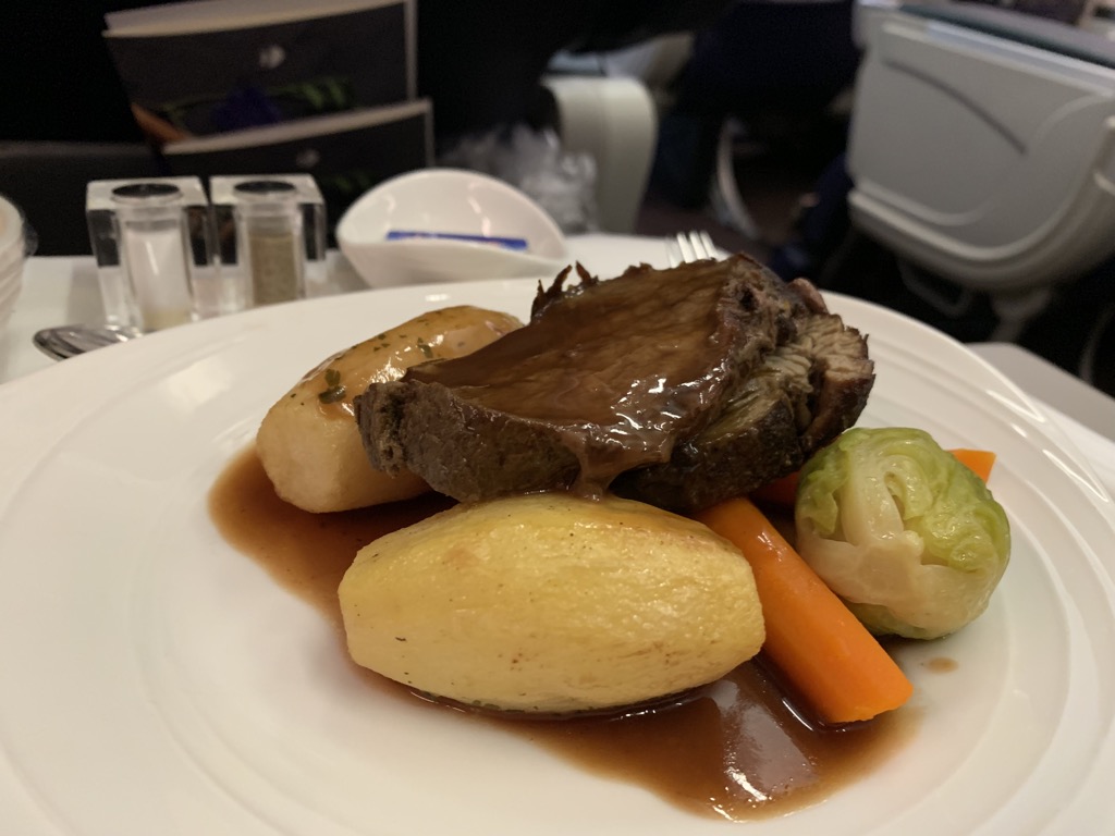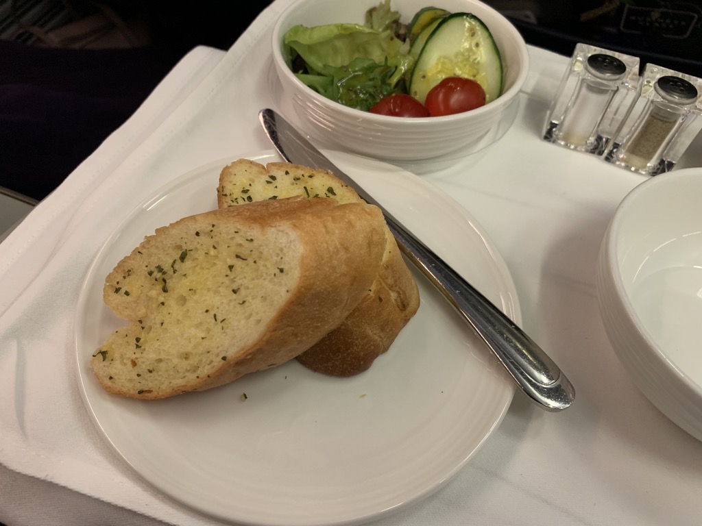 Auf dem kurzen Flug wird ein warmes Essen inklusive Vorspeise, Salat und Nachspeise serviert. Da es mir nicht so gut ging und ich Halsschmerzen hatte, habe ich auf Essen verzichtet. Christoph hat das Gebotene sehr gut geschmeckt.