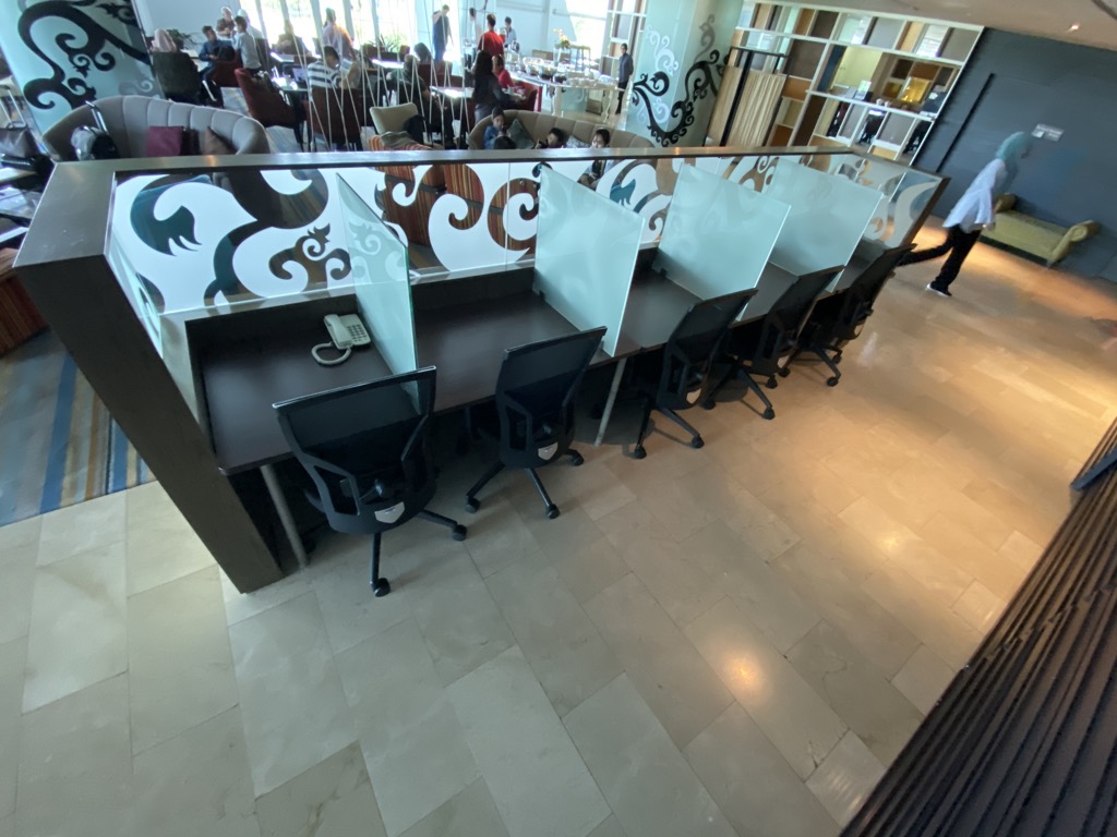 Im ersten Moment hat die Malaysia Airlines Golden Lounge einen überraschend positiven Eindruck gemacht. Sie war mit verschiedenen Sitzgruppen und Couchmöbeln ausgestattet und verfügte über reichlich Tageslicht, allerdings keinen Vorfeldblick – schade. Rechts vom Eingang befanden sich fünf kleine Schreibtische, die durch Milchglas getrennt waren. Hier konnte man noch etwas vor dem Abflug arbeiten.