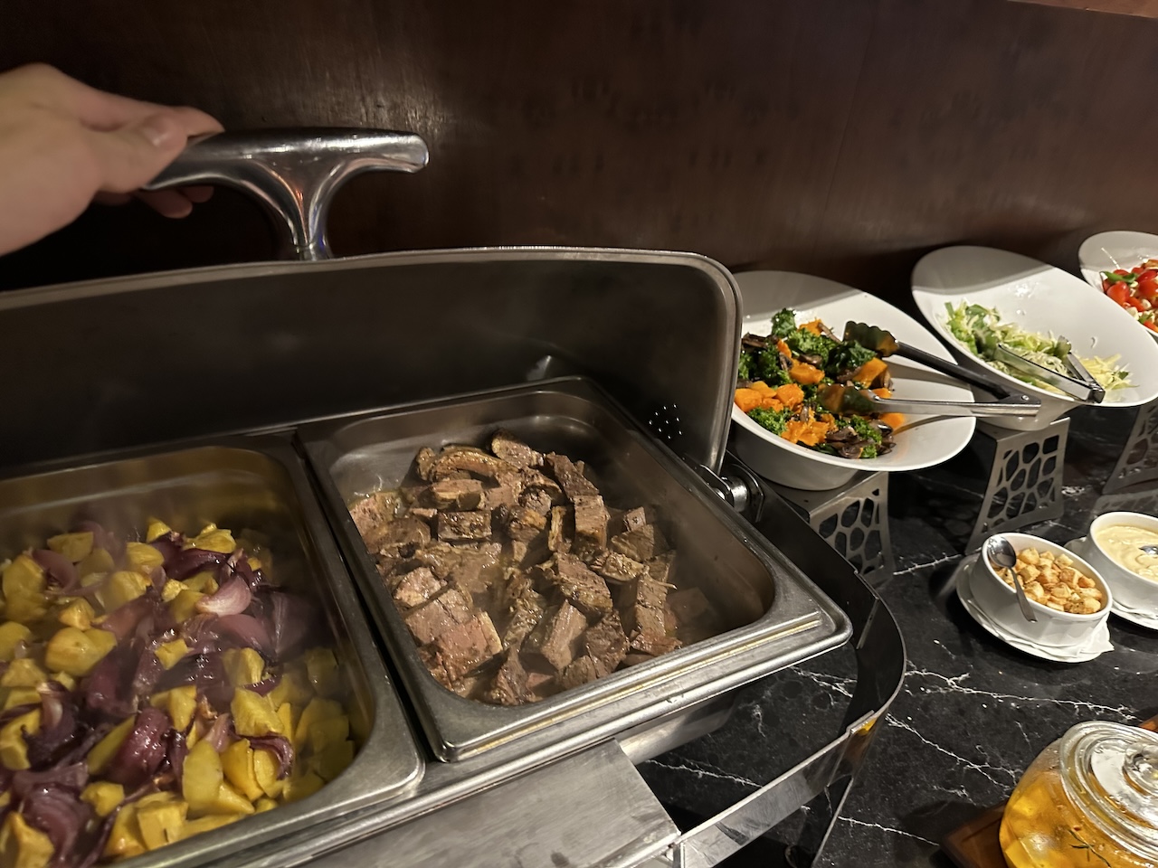 Neben dem Frühstück stehen tagsüber Softdrinks bereit, abends wird für 2 Stunden die Happy Hour eingeläutet. Neben kalten Snacks und Salaten wird auch warmes Essen aufgetischt. Die alkoholischen Getränke beschränken sich auf Bier und Wein.