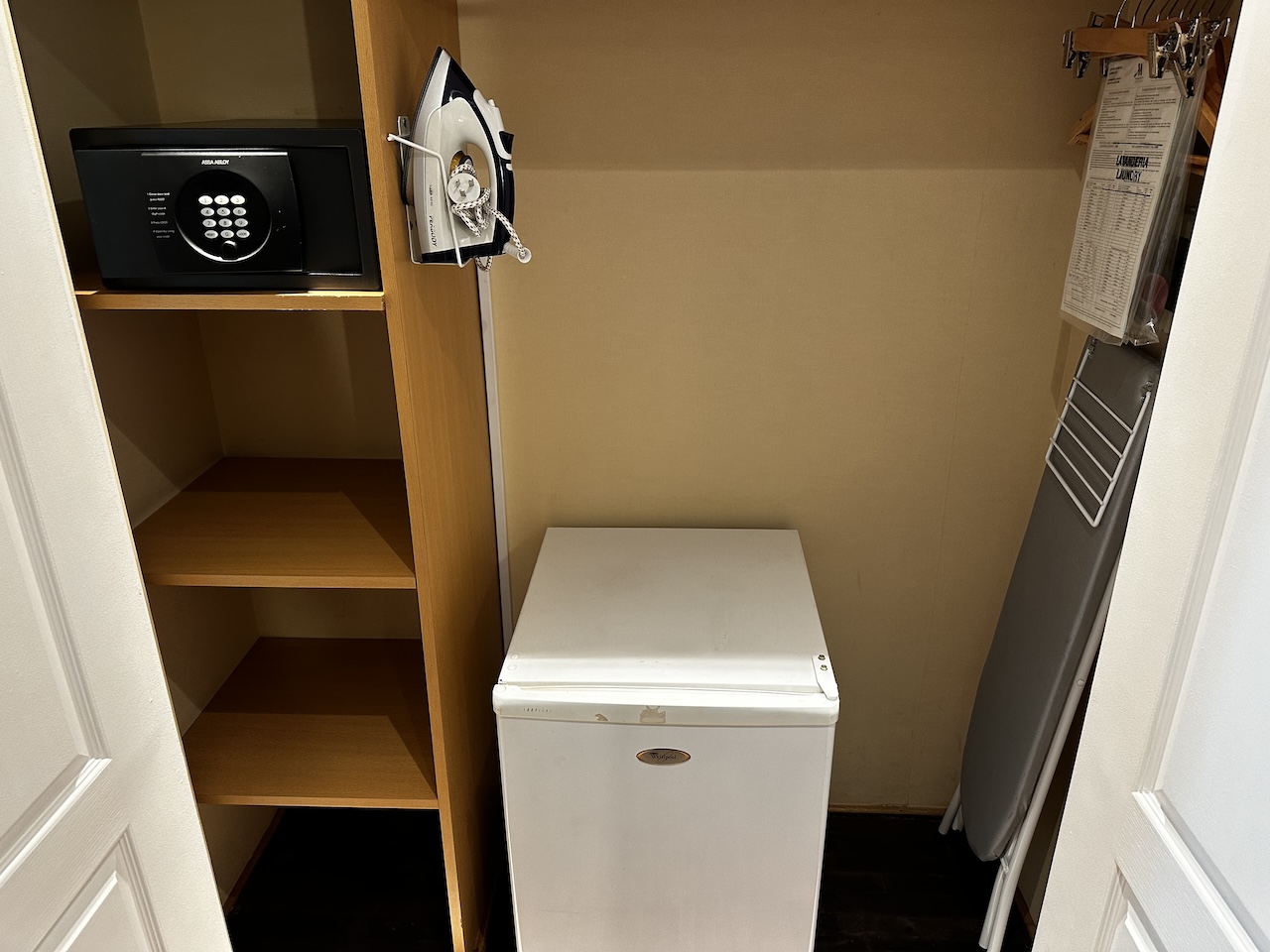 Für die Koffer gab es diesmal genug Platz, sonst findet man Wasserkocher, Kaffee & Tee, Safe, Bugelbrett usw.