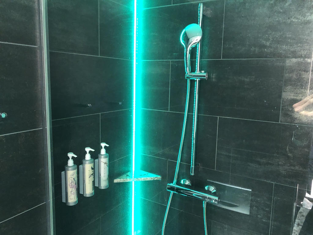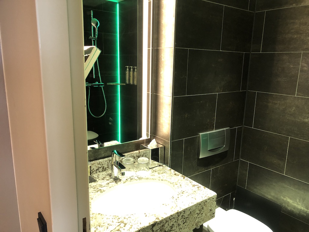 Das Bad ist leider ziemlich winzig geraten, man kommt aber zurecht. Es steht aber in keiner Relation zum restlichen Zimmer. Die üblichen Pflegeprodukte wurden in kleinen Größen bereitgestellt, in der Dusche sind große Flaschen für Schampoo & Co angebracht.