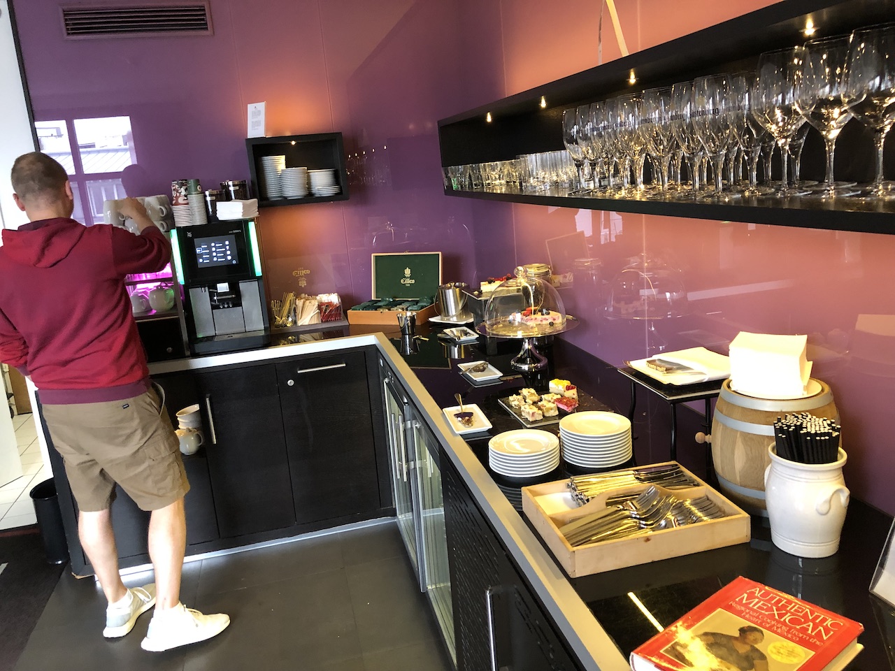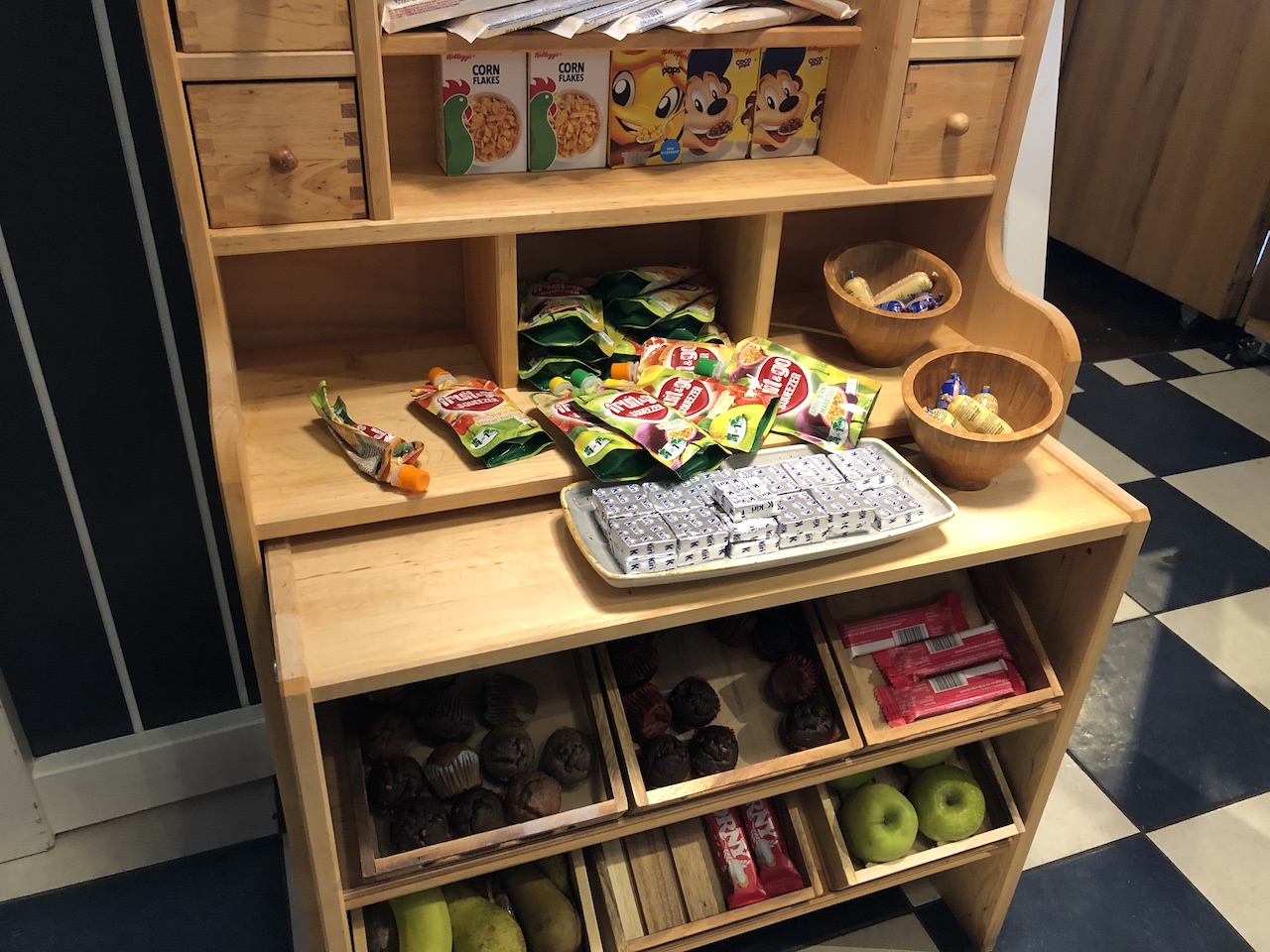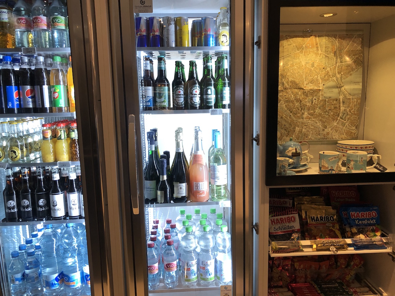 Morgens gibt es übrigens kostenfreie Kaffee und Tee, am Rezeptionstresen steht Wasser bereit. Daneben werden diverse Snacks, Süssigkeiten und Getränke zum Kauf angeboten, die Minibars in den Zimmern sind auch in diesem Hotel nicht mehr bestückt.