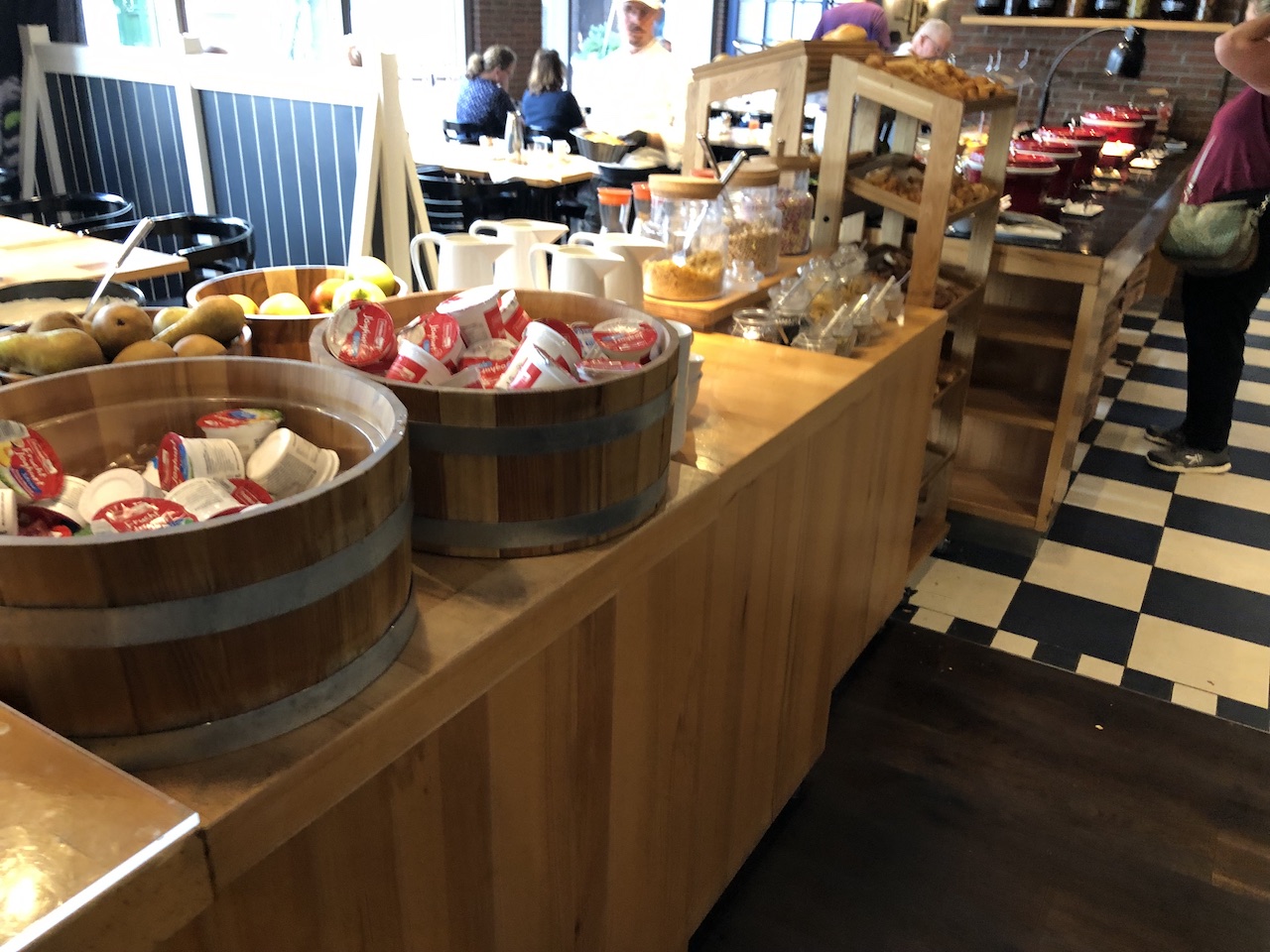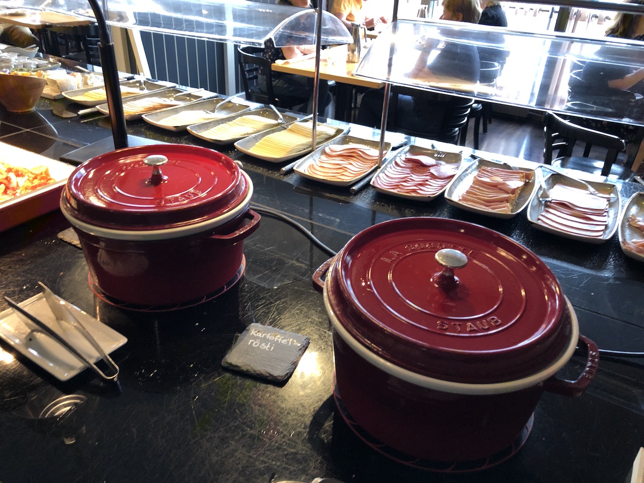 Gäste bedienen sich hier am reichhaltigen Buffet, Heissgetränke bestellt man beim Personal. Es gibt auch zahlreiche Optionen für Kinder und eine Eierstation.