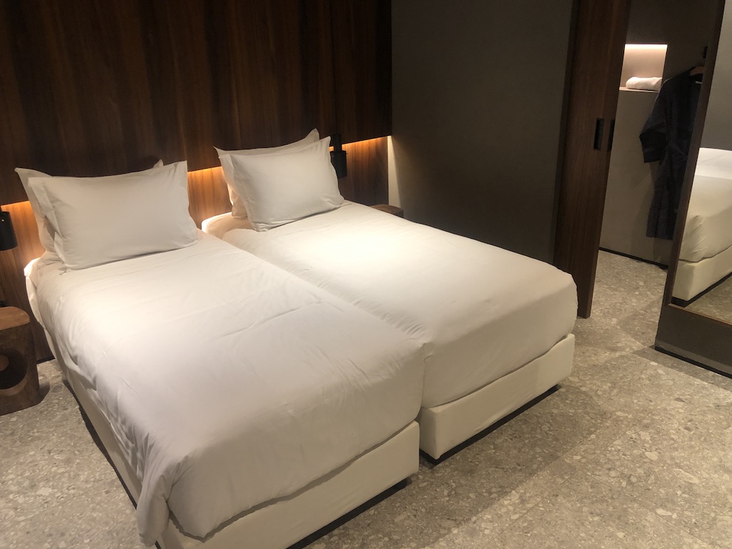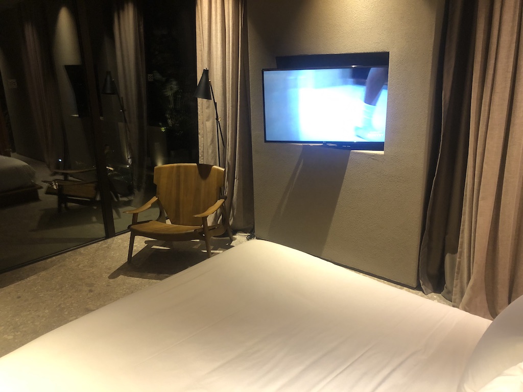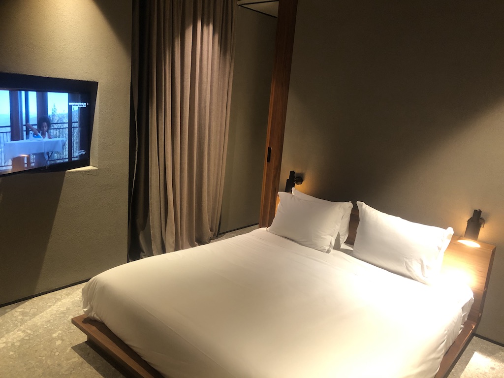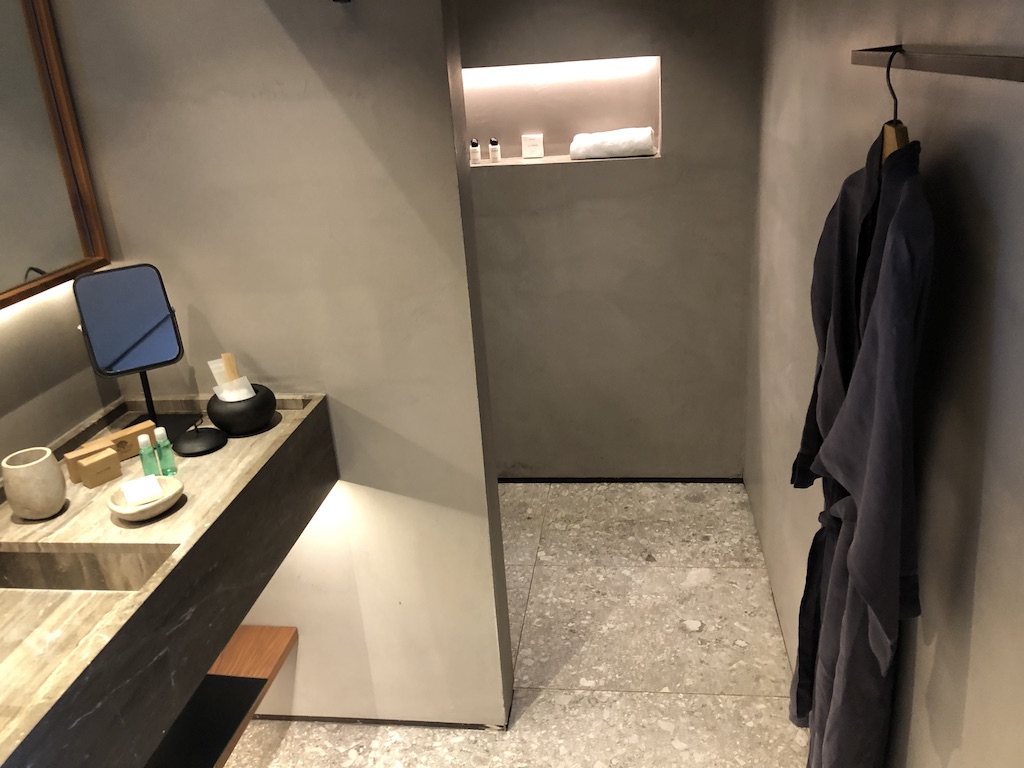 Das Zimmer ist schlicht, aber geschmackvoll ausgestattet. Der Raum war nicht mit Möbeln überladen, es kommt jedoch viel Beton zum Vorschein. Die Beleuchtung ist zum Teil indirekt und stellenweise dimmbar, im Badezimmer waren Oberlichter angebracht. Es gibt ausreichend Steckdosen und USB-Anschlüsse. Selbst im Kleiderschrank waren Stromanschlüsse vorhanden. Im Fernseher sind mehrere deutsche Sender installiert, zum Zeitpunkt unseres Aufenthaltes kamen die meisten Gäste aus dem deutschsprachigen Raum.