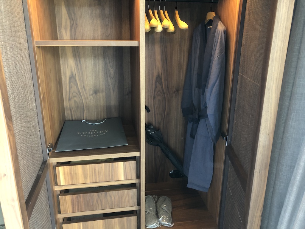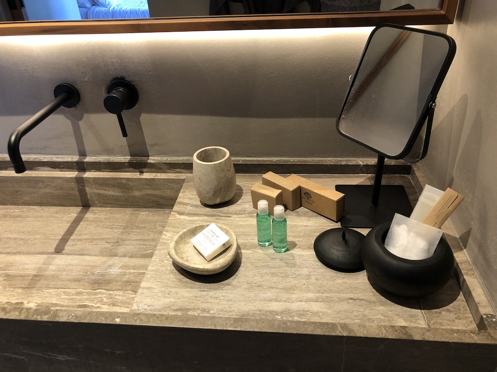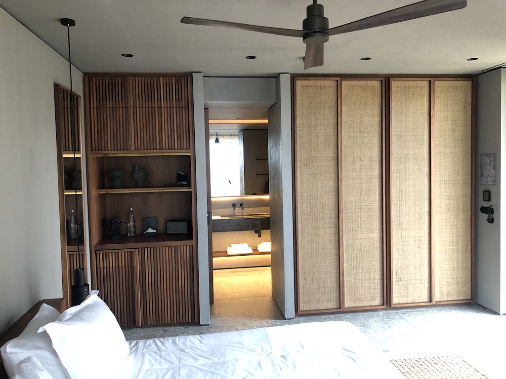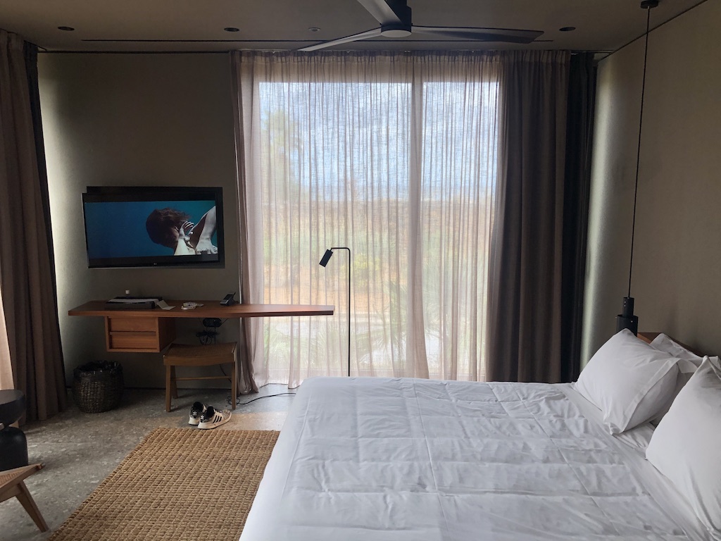 Das Zimmer ist schlicht, aber geschmackvoll ausgestattet. Der Raum war nicht mit Möbeln überladen, es kommt jedoch viel Beton zum Vorschein. Die Beleuchtung ist zum Teil indirekt und stellenweise dimmbar, im Badezimmer waren Oberlichter angebracht. Es gibt ausreichend Steckdosen und USB-Anschlüsse. Selbst im Kleiderschrank waren Stromanschlüsse vorhanden. Im Fernseher sind mehrere deutsche Sender installiert, zum Zeitpunkt unseres Aufenthaltes kamen die meisten Gäste aus dem deutschsprachigen Raum.